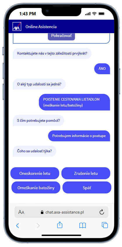 Potrebujete pomoc hneď a bez telefonovania? Spustite Online Asistenciu – chatbot prijme váš prípad, nájde najbližšie miesto ošetrenia alebo vám poskytne okamžité rady, čo robiť. Stačí mať pripojenie na internet.