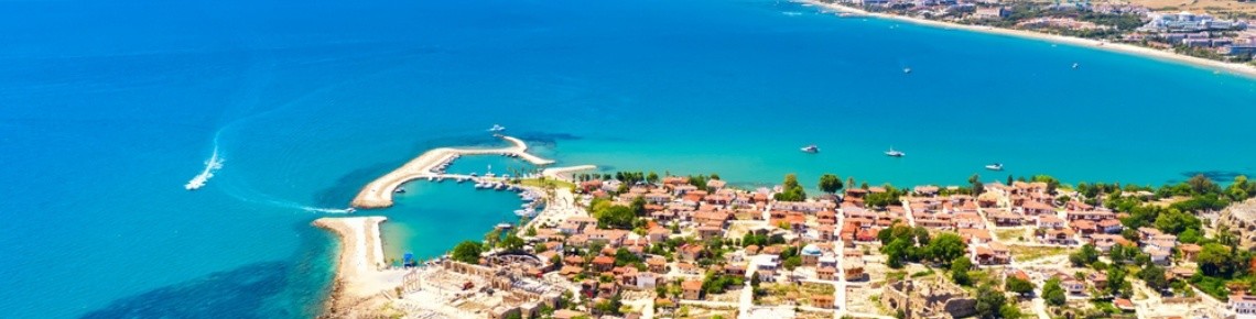 Prístav pri Egejskom mori s historickými pamiatkami, letiskom a kamienkovými aj pieskovými plážami.