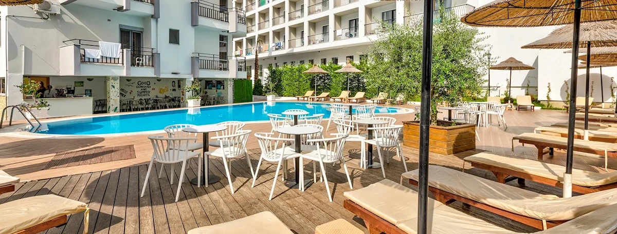 Całodobowa recepcja, lobby, winda. 1 basen (ok. 100 m2, nieregularny kształt), leżaki i parasole przy basenie, ręczniki basenowe dostępne w recepcji za kaucją zwrotną (ok. 10 EUR/ręcznik). Restauracje: restauracja, bar przy basenie.