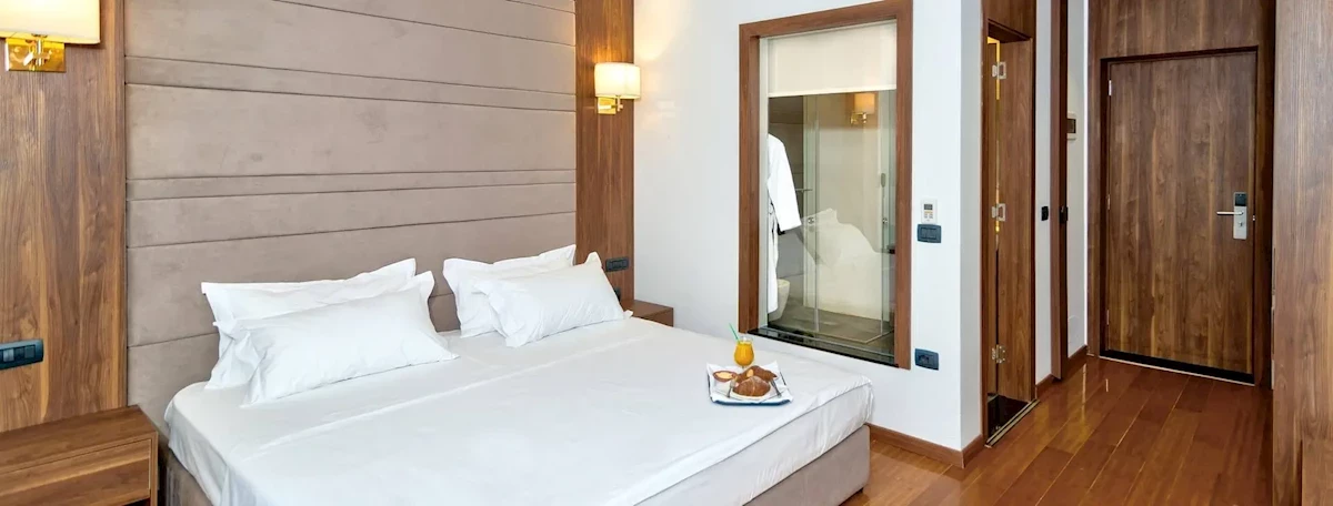 K dispozícii sú nové, vkusne a moderne zariadené priestranné dvojlôžkové izby s možnosťou jednej, resp. dvoch prísteliek. Rodinné izby s 2 oddelenými spálňami až pre 5 osôb (za príplatok). Časť izieb s výhľadom na more (za príplatok). Klimatizácia, TV, mini chladnička, príslušenstvo (kúpeľňa, WC, fén), balkón s posedením.Strava