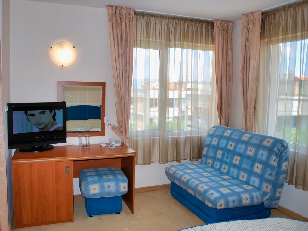 Pokoje s balkonem a sociálním zařízením (sprcha, WC, fén) jsou klimatizovány (klimatizace zdarma) a jsou vybaveny TV/SAT, Wi-Fi (zdarma), telefonem, trezorem (za poplatek) a chladničkou. Možnost jedné přistýlky (rozkládací gauč). Maximální obsazenost tři dospělí.