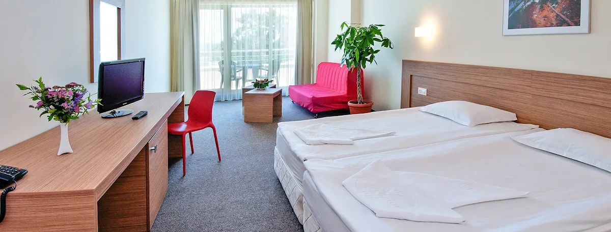 Klimatizované (klimatizace zdarma) a komfortní pokoje s balkonem a sociálním zařízením (sprchový kout, WC, fén) jsou vybaveny TV/SAT (i s nabídkou českých programů), telefonem, Wi-Fi (zdarma), trezorem (zdarma), chladničkou a varnou konvicí. Možnost dvou přistýlek. Maximální obsazenost čtyři dospělí. V hotelu jsou k dispozici i pokoje 2+3 (jedna místnost, maximální obsazenost pět dospělých), pokoje 3+2 (jedna místnost, maximální obsazenost pět dospělých), pokoje bez balkonu (bez možnosti přistýlky, zvýhodněná cena), studia 2+2 (jedna prostorná obytná místnost, maximální obsazenost čtyři dospělí) a senior suity 3+3 (ložnice, denní místnost s rozkládacím gaučem a ložnicí – nejsou stavebně odděleny, maximální obsazenost šest dospělých). Studia a suity s balkonem a výhledem na moře jsou klimatizovány (klimatizace zdarma) a vybaveny TV/SAT (i s nabídkou českých programů), telefonem, Wi-Fi (zdarma), trezorem (zdarma), chladničkou a varnou konvicí.