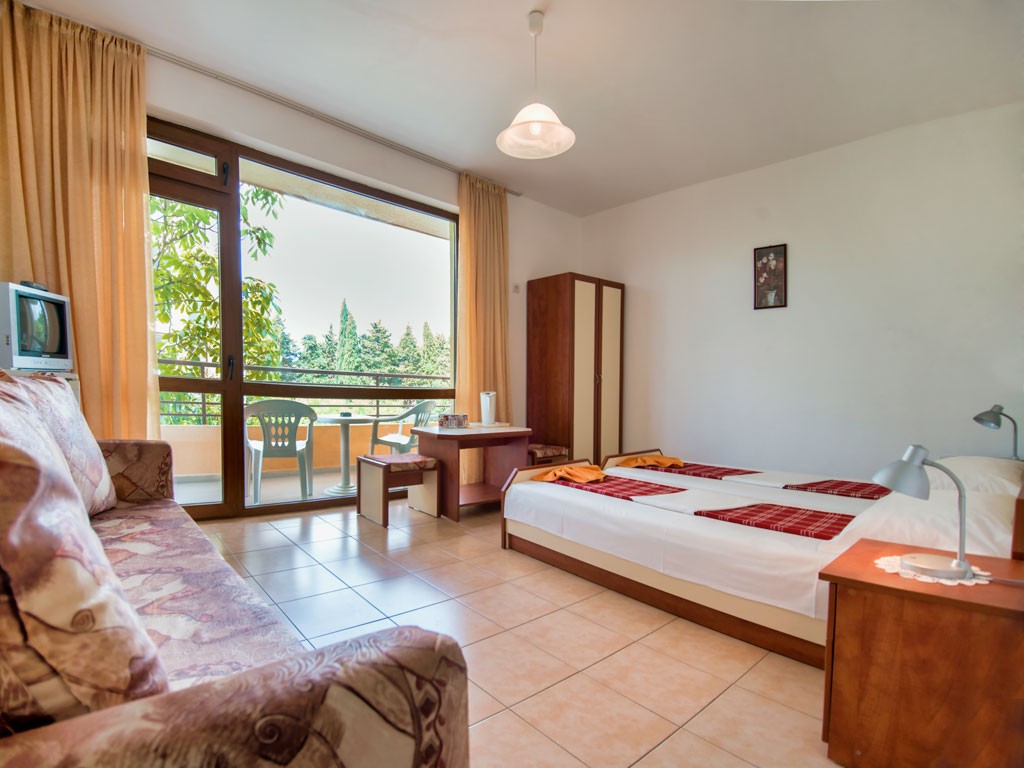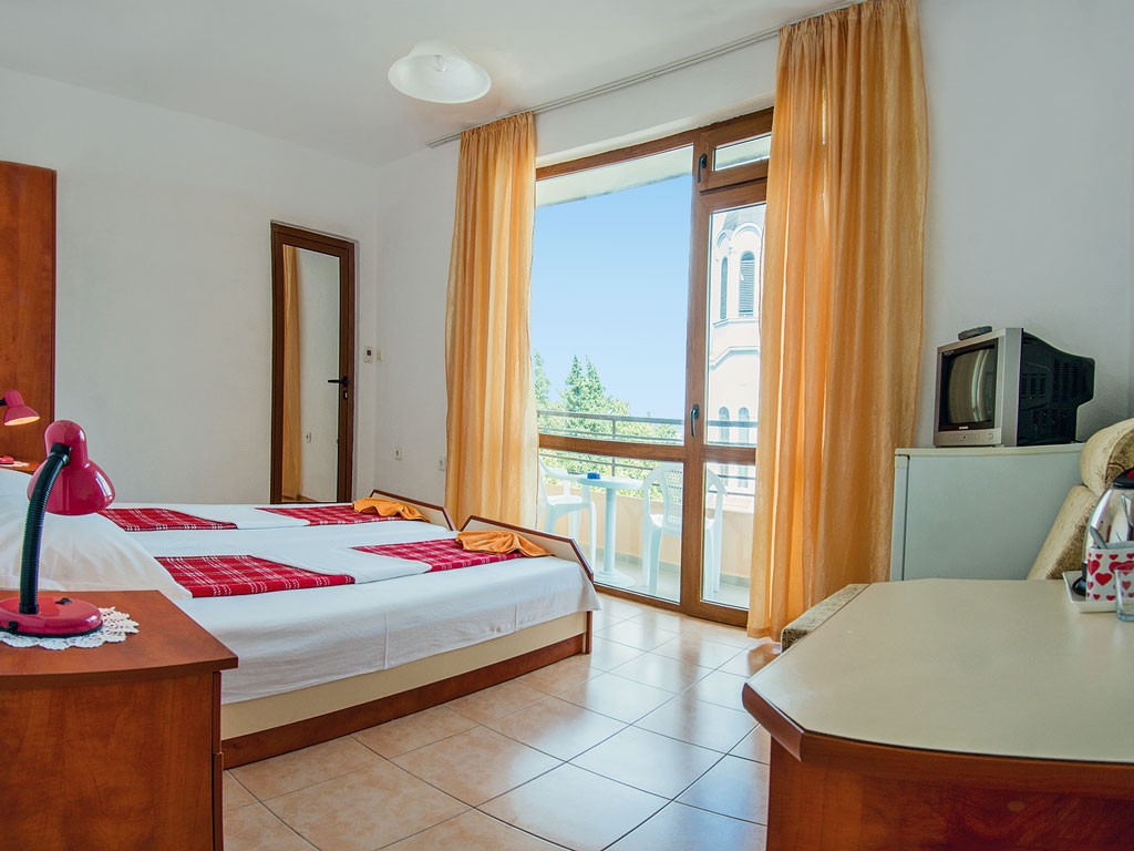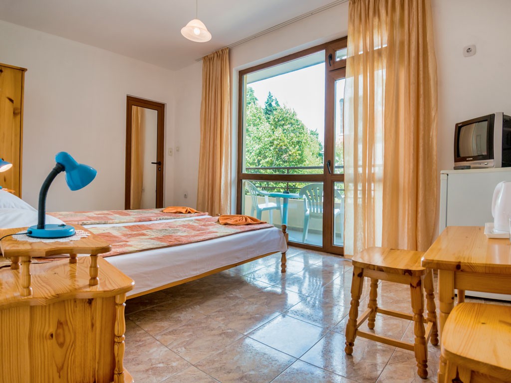 Pokoje s balkonem a sociálním zařízením (sprcha, WC) jsou klimatizovány (klimatizace zdarma) a vybaveny TV, chladničkou a varnou konvicí. Možnost až dvou přistýlek (rozkládací gauč). Maximální obsazenost čtyři dospělí.