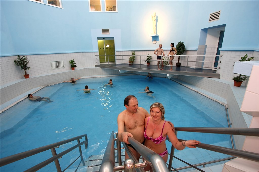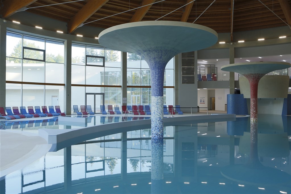 Vnitřní termální bazén v Lázeňském hotelu Eliška Dominantním zdrojem vody zůstává přírodní termální pramen Žerotín, využívaný k léčbě pohybového aparátu už od 16. století. Voda o teplotě přibližně 35°C je bohatá na síru a další minerální látky, které podporují regeneraci těla i mysli. TERMÁLY LOSINY - unikátní termální park v Lázních Velké Losiny (360 m): - 9 termálních bazénů, teplota vody až 36 °C, celoroční provoz - bazény naplněné léčivou termální minerální sirnou vodou - přírodní léčivý pramen vyvěrá z hloubky více než 1000 m - termální voda přispívá k uvolnění a relaxaci Vnitřní bazény: • relaxační bazén s průplavem ven, perličková sedátka a lehátka a hydromasážní trysky (teplota vody 32 - 34°C) • termální bazén se sedátky (teplota vody 34 - 36 °C), doporučená doba pobytu je max. 20 min. • aktivní bazén s vodními atrakcemi - divoká řeka, jeskyně, chrliče (teplota vody 30 - 32 °C) • dětský bazén s vodními atrakcemi - skluzavka, vodní ježek a trysky vodního pramene (teplota vody 34 - 36° C) • panoramatický bazén nad jeskyní, se sedátky, jedinečný výhled na vodní plochy, u bazénku je relaxační zóna s lehátky (teplota vody 32 - 34 °C) Venkovní areál: • relaxační bazén s průplavem do vnitřní části (teplota vody 32 - 34 °C) • termální bazén s relaxačními perličkovými lehátky a sedátky, hydromasážní trysky (teplota vody 32 - 34 °C) • aktivní bazén s tobogánem, chrličem, vodním deštníkem (teplota vody 30 - 32 °C) • dětský bazén s vodními atrakcemi - hřib, skluzavka, trysky přesného plyvnutí (teplota vody 34 - 36 °C) • letní pergola a možnost ukrýt se před sluncem v denních apartmánech • občerstvení v letním venkovním kiosku UPOZORNĚNÍ: Stříbro v termální sirné vodě černá!
