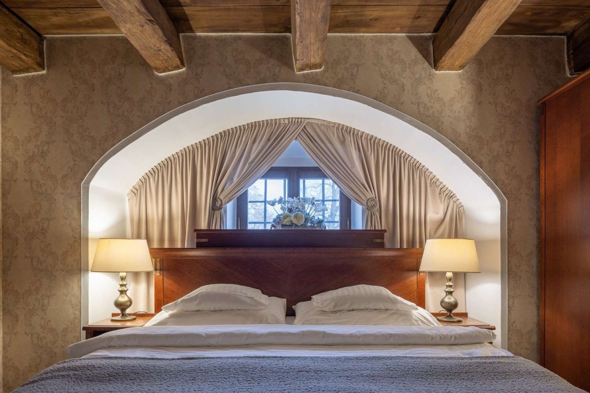 Dvoulůžkový pokoj Deluxe s rohovou vanou s možností jedné přistýlky, s kvalitní kosmetikou, vysoušečem vlasů, pantoflemi, TV, trezorem, antialergickými polštáři a přikrývkami, setem na přípravu kávy a čaje zdarma k dispozici, pracovním stolem a židlí, s minibarem za poplatek, Wi-Fi připojením zdarma. Velikost pokoje je 20m2.