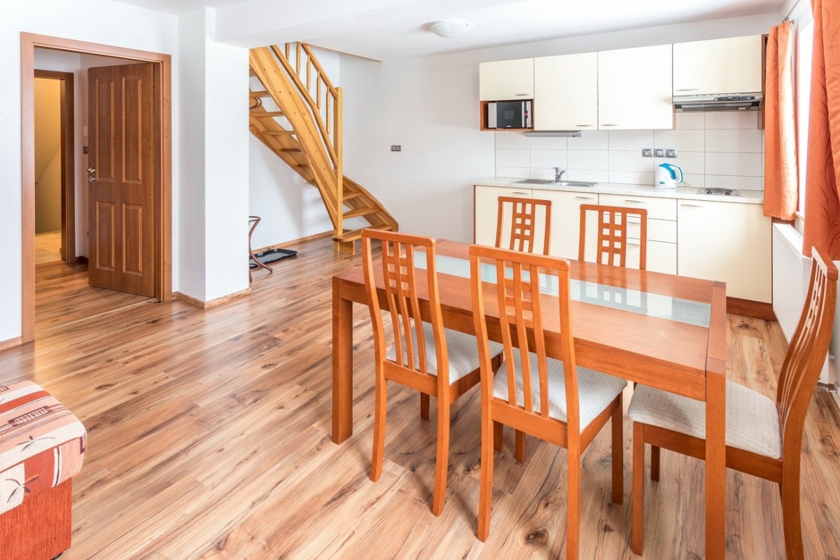 V sedmilůžkovém apartmánu s vlastním sociálním zařízením se sprchou, TV/SAT, taburetem, konferenčním stolkem, jídelním stolem se židlemi, plně vybavenou kuchyňskou linkou (dvouplotýnkový vařič, rychlovarná konvice, mikrovlnná trouba, lednice, nádobí, příbory, sklenice, prkénko, vařečka, naběračka, obracečka, struhadlo, hrnce, pánvička, odpadkový koš), připojením k internetu přes Wi-Fi.