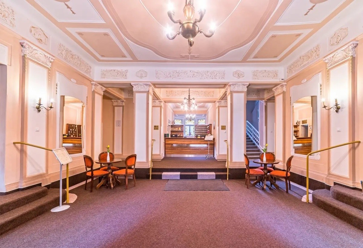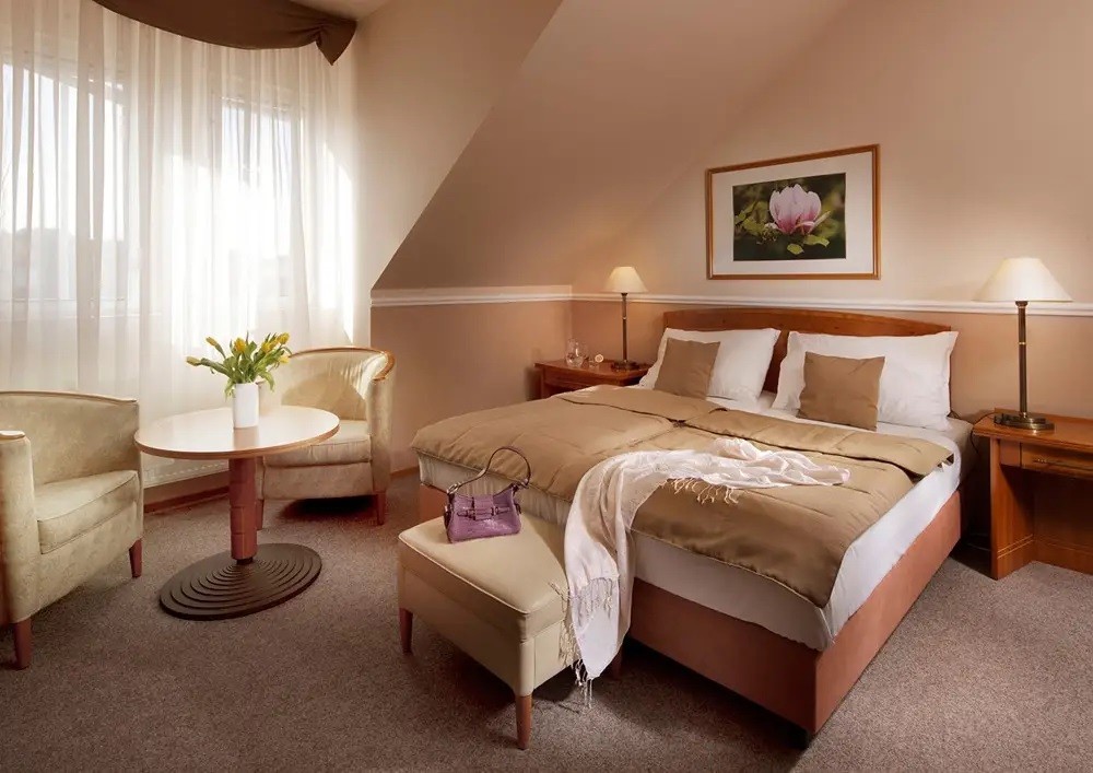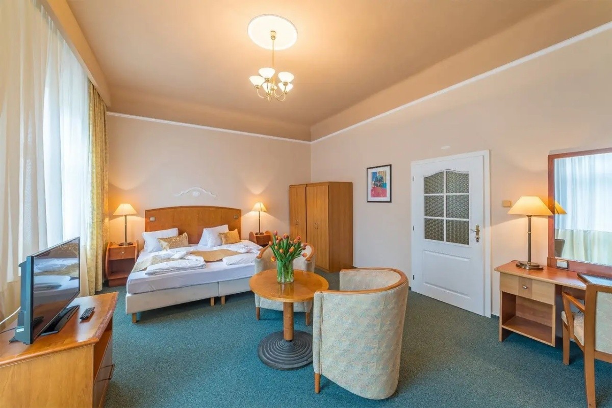 Komfort: Doporučujeme všem hostům, kteří si chtějí dopřát prostorný pokoj s příjemnou atmosférou lázeňského hotelu. Většina pokojů má balkón a výhled přímo do přilehlého parku.