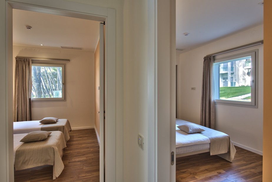 Hosté se zde mohou ubytovat v komfortních dvouložnicových apartmánech typu Superior pro čtyři až šest osob (105 m²). Apartmány jsou vkusně zařízené elegantním nábytkem a moderní technologií. Jsou situovány ve dvoupatrových budovách a mají balkony nebo terasy s výhledem na moře nebo do parku. Ke standardní výbavě patří dvě luxusní ložnice s manželskými postelemi, prostorný obývací pokoj s rozkládacím gaučem, který může sloužit jako přistýlka pro další dvě osoby, plně vybavená kuchyně se sklokeramickou varnou deskou, myčkou nádobí, mikrovlnou troubou, horkovzdušnou troubou a ledničkou s mrazákem, moderní koupelna se sprchovým koutem, toaletou a bidetem, další oddělené WC, pračka a venkovní posezení na balkoně nebo na terase.