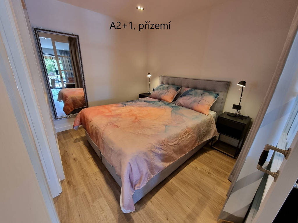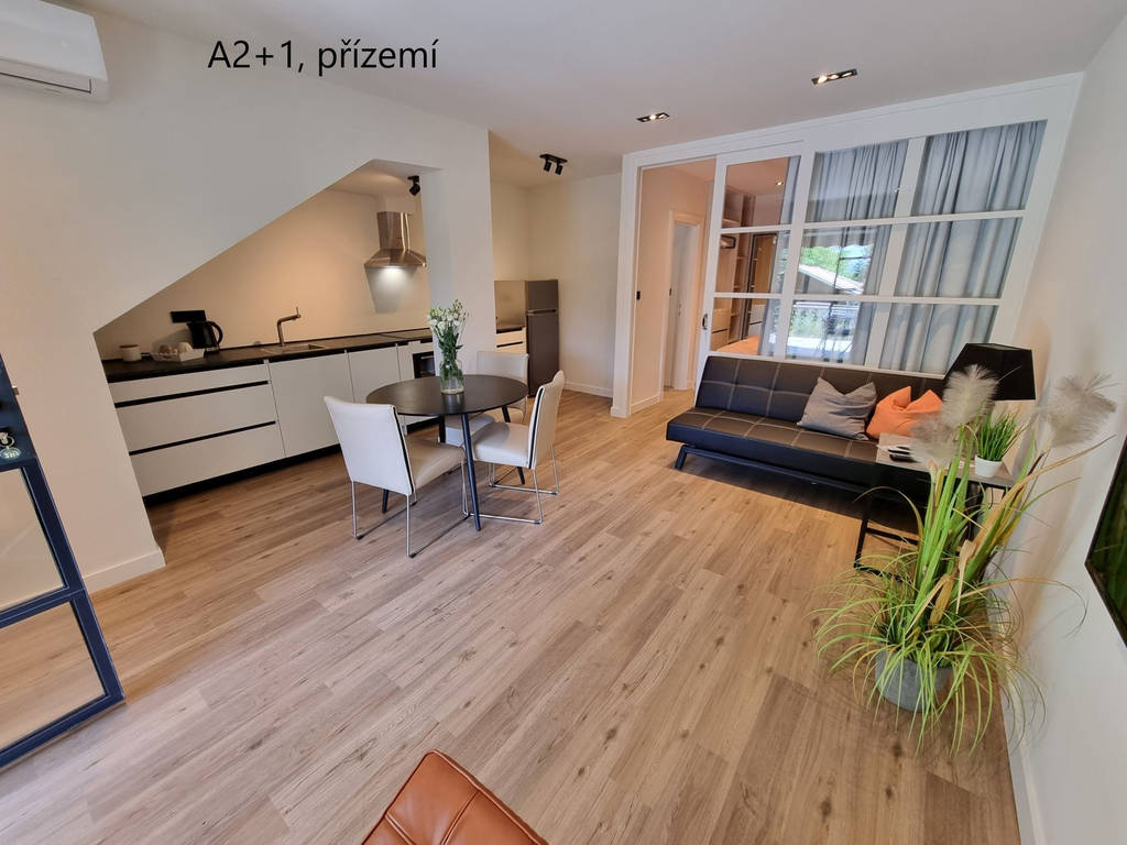 TYP A2+1: ložnice se 2 lůžky, kuchyň s možností přistýlky, hyg. zařízení, SAT TV, klimatizace a terasa.