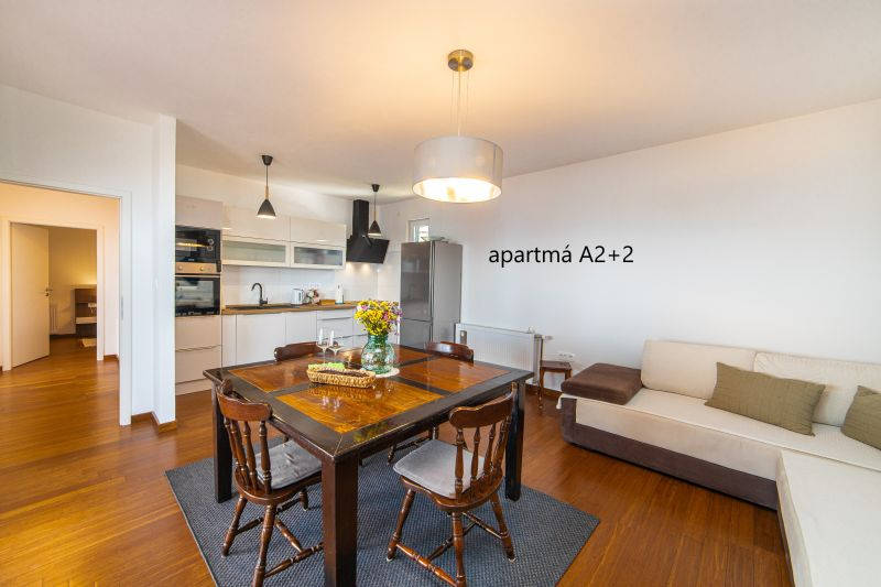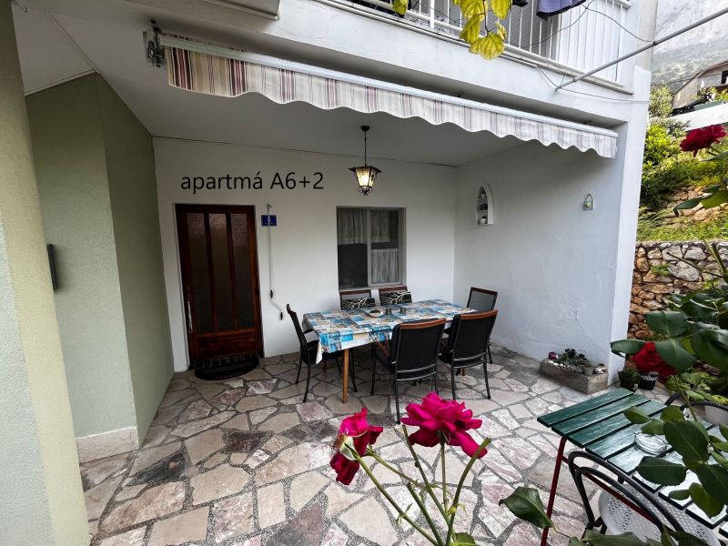 TYP A6+2, přízemí: 3 ložnice se 2 lůžky, kuchyň s možností rozkládacího gauče, hyg. zařízení, TV, klimatizace a teresa.