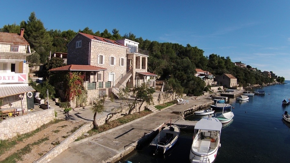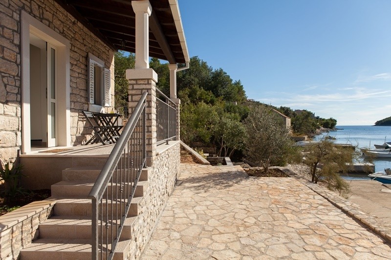 50 m - malá oblázková pláž, další oblázkové pláže vzdálené 3 - 5 km jsou dotupné lodí, na kole nebo autem.