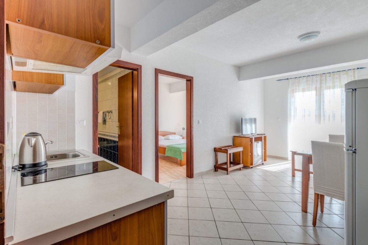 Dobre a vkusne zariadený apartmánový dom sa nachádza v pokojnejšej časti letoviska, asi 300 m do centra, neďaleko prekrásnej kamienkovej pláže. Bohaté športové a kultúrne vyžitie.Vybavenie