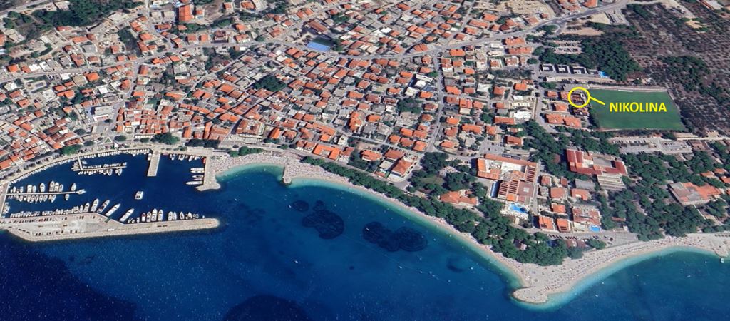 Pekná, dlhá kamienková pláž s pozvoľným vstupom do mora (vhodné pre deti i neplavcov), blankytne modrou vodou a krásnym výhľadom na okolité pohoria je vzdialená 200 m od ubytovanie (prístup cez miestnu komunikáciu). Klientom sú k dispozícii lehátka a slnečníky (za poplatok).Neoficiálny popis ubytovanie