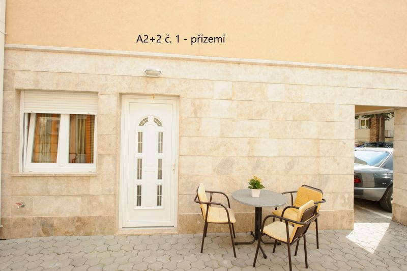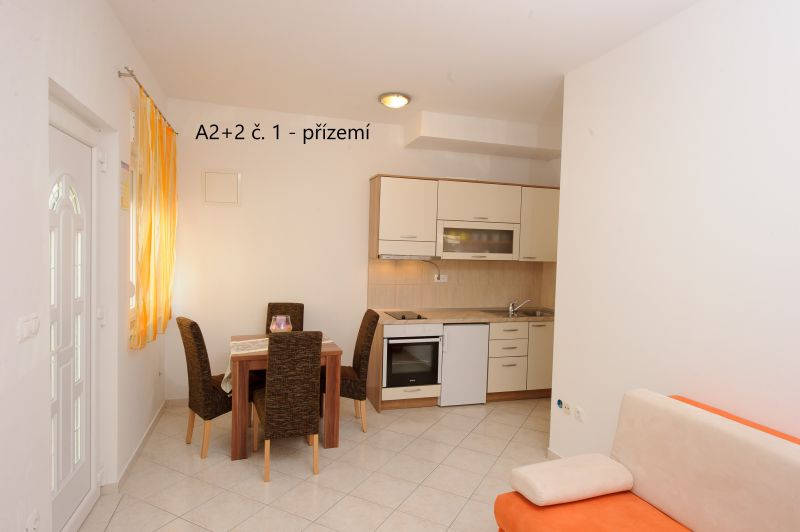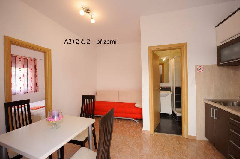 TYP S2+2 č. 2, depandace, přízemí: 2-lůžkový pokoj se 2 přistýlkami (může být 2 x rozkládací gauč pro 2 osoby) s kuchyňským koutem, hyg. zařízení, SAT TV, klimatizace a otevřená terasa před domem.