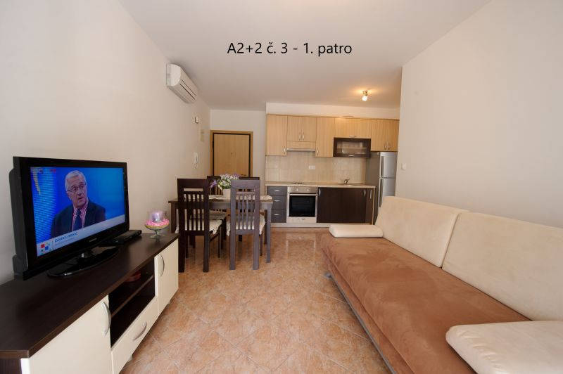 TYP A4+4 č. 10, depandance, 1. patro: ložnice se 4 lůžky, kuchyň se 2 gauči na rozložení, každý pro 2 osoby, hyg. zařízení, SAT TV, klimatizace a terasa.