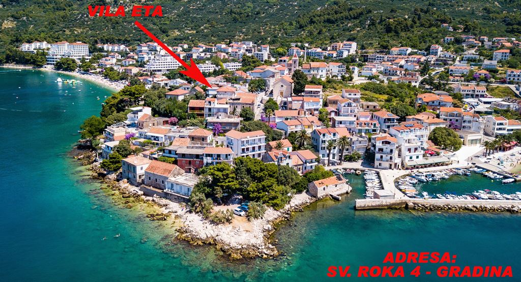 Vila ETA je pěkná vila s vynikající polohou, která se nachází v blízkosti pláže i centra. Gradac je nejjižnějším místem Makarské riviéry, ležícím pod mohutným masivem hory Rilič. Je to bývalá rybářská vesnice, která byla vybudována na zbytcích římské osady Labineca. Město leží uprostřed zeleně u jadranské magistrály a zdejší oblázkové pláže patří k nejkrásnějším na Makarské riviéře.