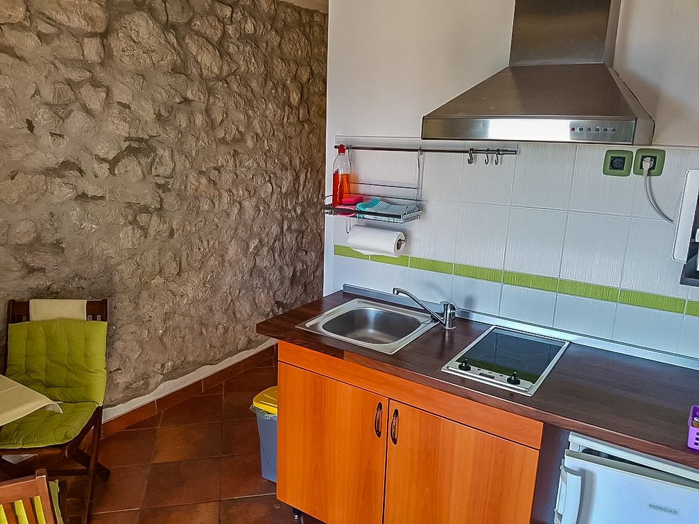 jedna místnost s ložnicí, koupelnou s WC, kuchyňkou (lednice, mikrovlnka, varná deska, kuchyňské vybavení pro základní stolování a přípravu jídla), TV, klimatizací a wifi zdarma. Studio se nachází v přízemí, má společnou terasu a orientaci na moře.