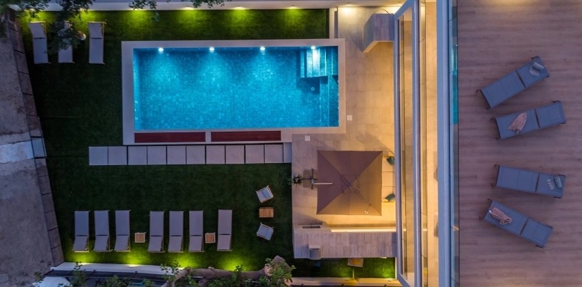 Venkovní vyhřívaný bazén zajišťuje pohodlí i v chladnějších měsících.