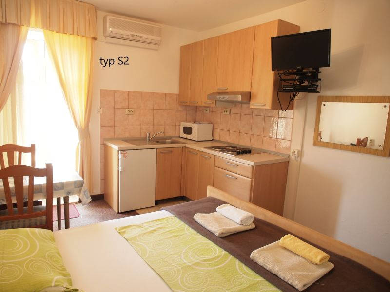 TYP S2: 2-lůžkový pokoj s kuchyňským koutem, hyg. zařízení, SAT TV a balkon.