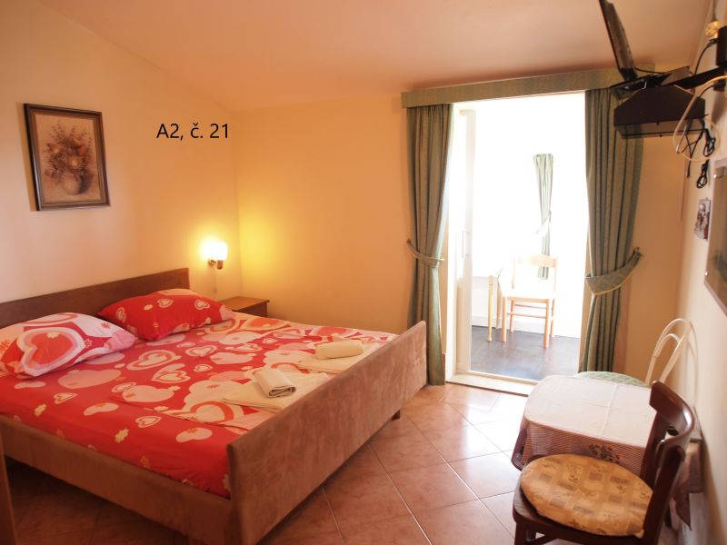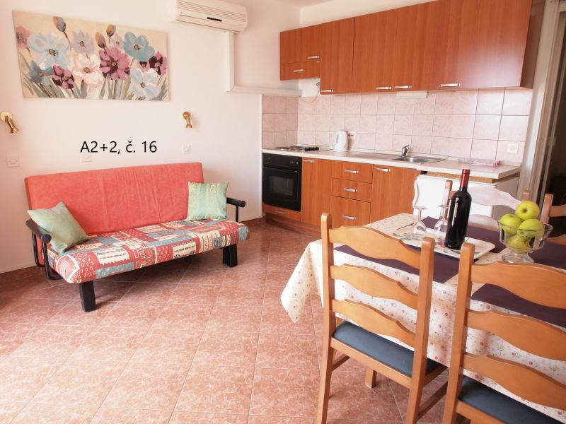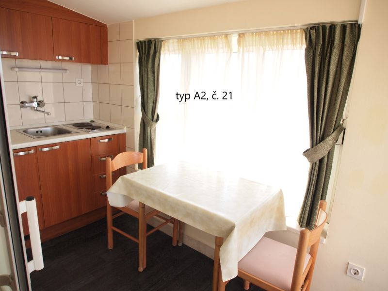 TYP A2, A2+1 a A2+2: ložnice se 2 lůžky, kuchyň s obývací částí a gaučem na rozložení pro 2 osoby, hyg. zařízení, SAT TV, klimatizace a balkon.