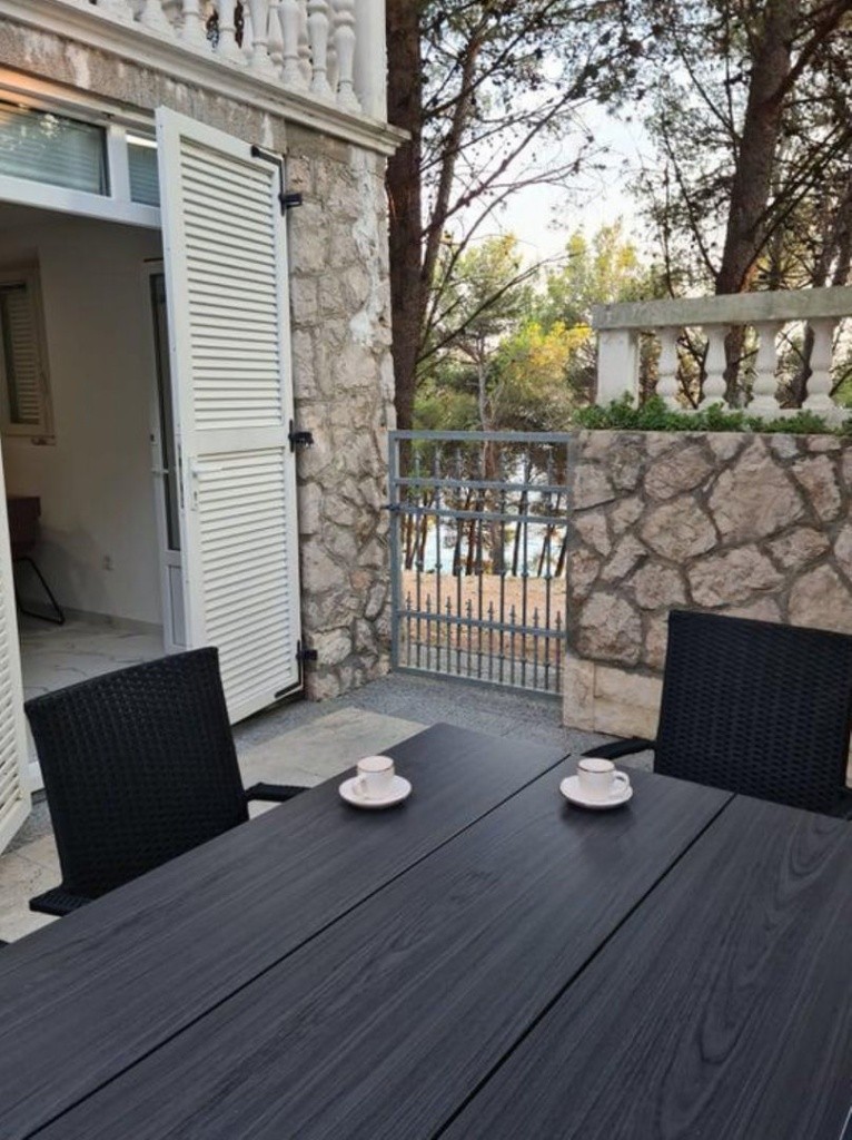 moderní apartmánový dům se nachází v první linii od moře, od kterého ho dělí pouze úzký pás borovicového lesa. Villa je situována v klidném letovisku Dolaška Drage, které je jen 3 km od Pakoštane a nachází se mezi Jaderským mořem a Vranským jezerem. Naproti letovisku Drage se nachází kouzelný ostrov Vrgada s písečnou pláží, kam se můžete vydat na výlet z Pakoštane. V blízkosti vily u pláže se nachází restaurace s barem, malý obchod je pak asi 100 m od vily. Na nákupy doporučujeme velký supermarket v sousedním Pakoštane. Pláž je zde přírodní kamenitá nebo oblázková s pozvolným vstupem do moře. Letovisko je ideální pro každého, kdo hledá klidnou dovolenou. Moře je od vily vzdáleno cca 50 metrů.