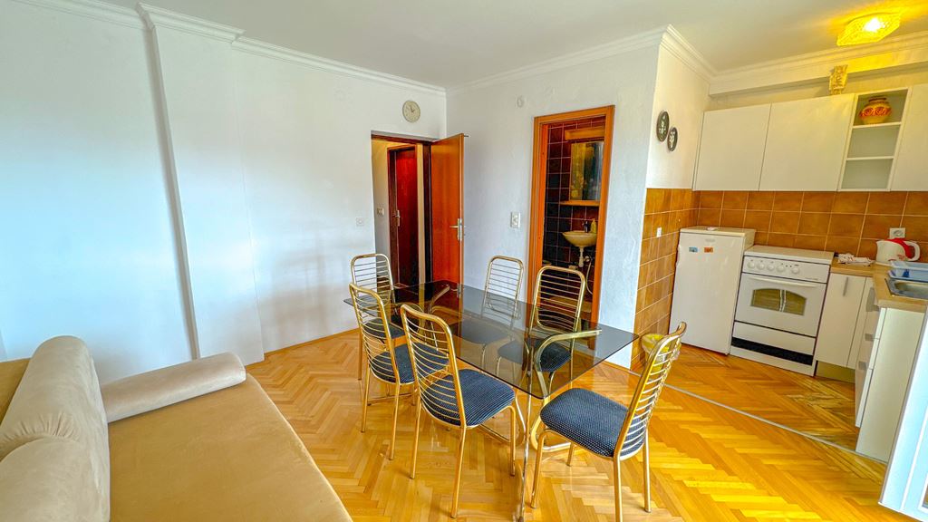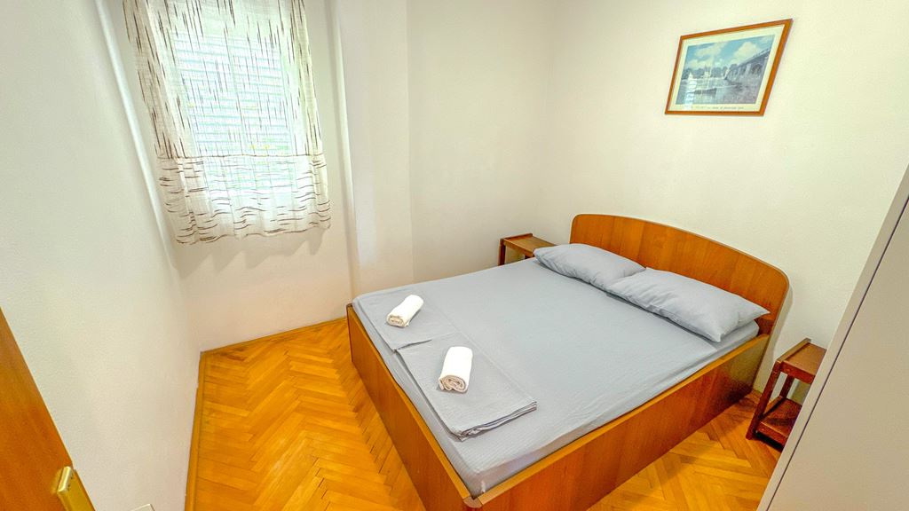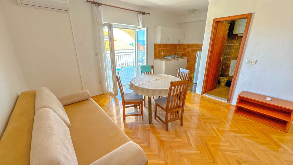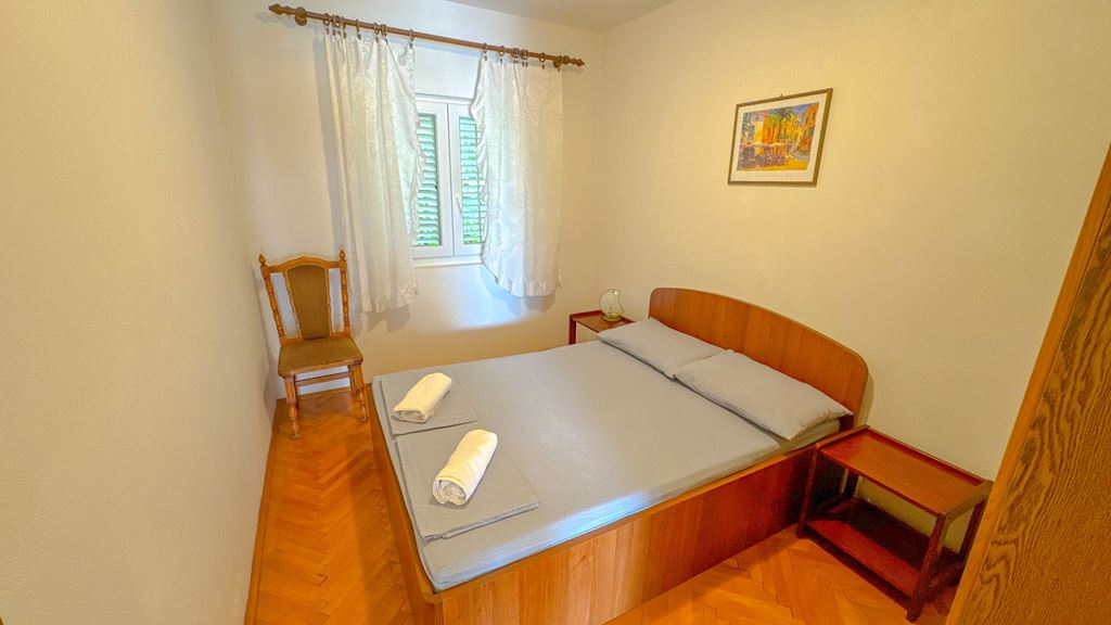 s možností přistýlky. Skládá se ze dvou prostorově malých, oddělených ložnic s příslušným počtem lůžek, obývacího pokoje s rozkládací pohovkou pro dospělou osobu anebo pro dvě děti do 12 let, kuchyňským koutem, vlastním sociálním zařízením, klimatizací a wifi zdarma. Apartmány se nachází na zvýšeném přízemí nebo v 1. patře. Každý apartmán má terasu s orientací k moři.