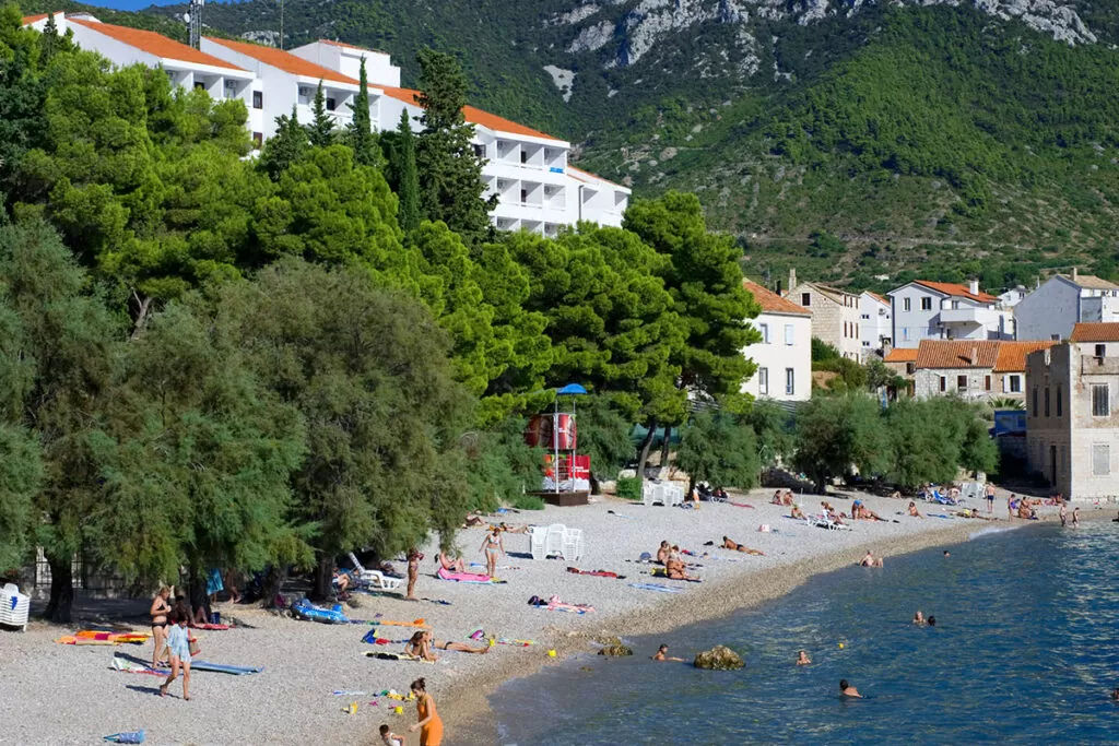 Pekná, široká kamienková pláž s pozvoľným vstupom do mora (vhodné pre deti i neplavcov) a sezónnou ponukou motorizovaných aj nemotorizovaných vodných športov (za poplatok) sa nachádza 20 m od hotela (prístup cez miestnu komunikáciu). Klientom sú k dispozícii lehátka a slnečníky (za poplatok). Pláže v letovisku boli ocenené prestížnou Modrou vlajkou EÚ za čistotu a kvalitu vody.Neoficiálny popis ubytovanie