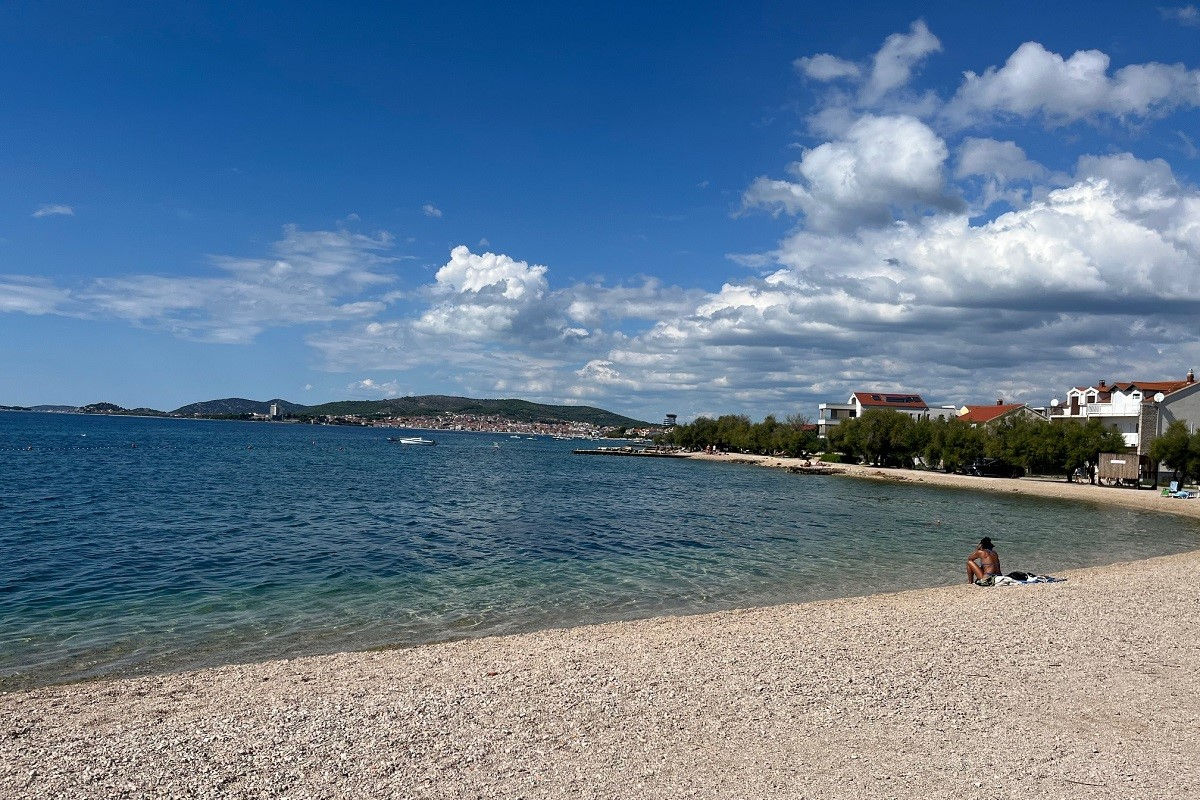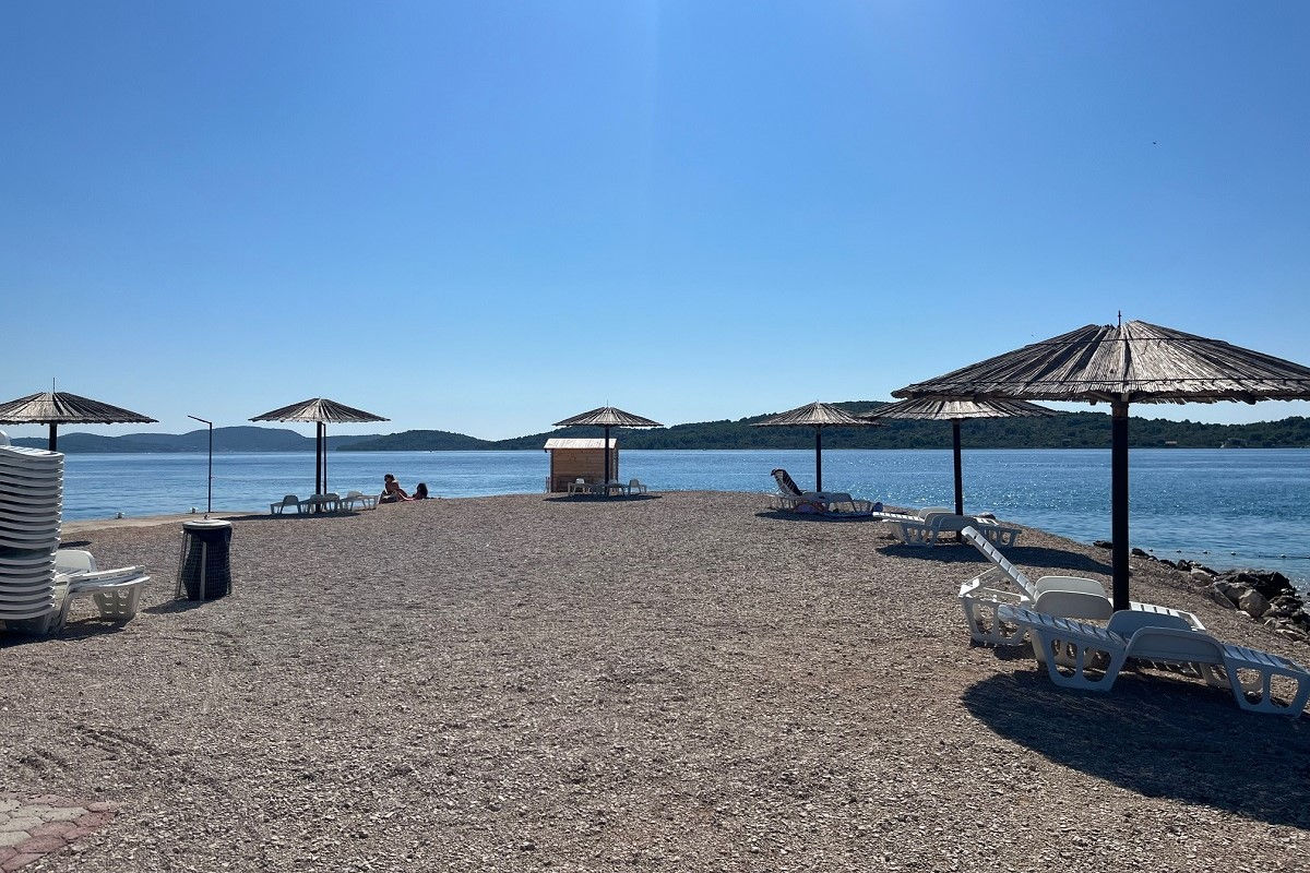 Vstup do moře je pozvolný, ideální pro malé děti. Do centra Vodic vede 2 km dlouhá promenáda. Na pláži jsou atrakce pro děti, stánky s občerstvením, blízko je pekárna a stánky s ovocem a zeleninou.