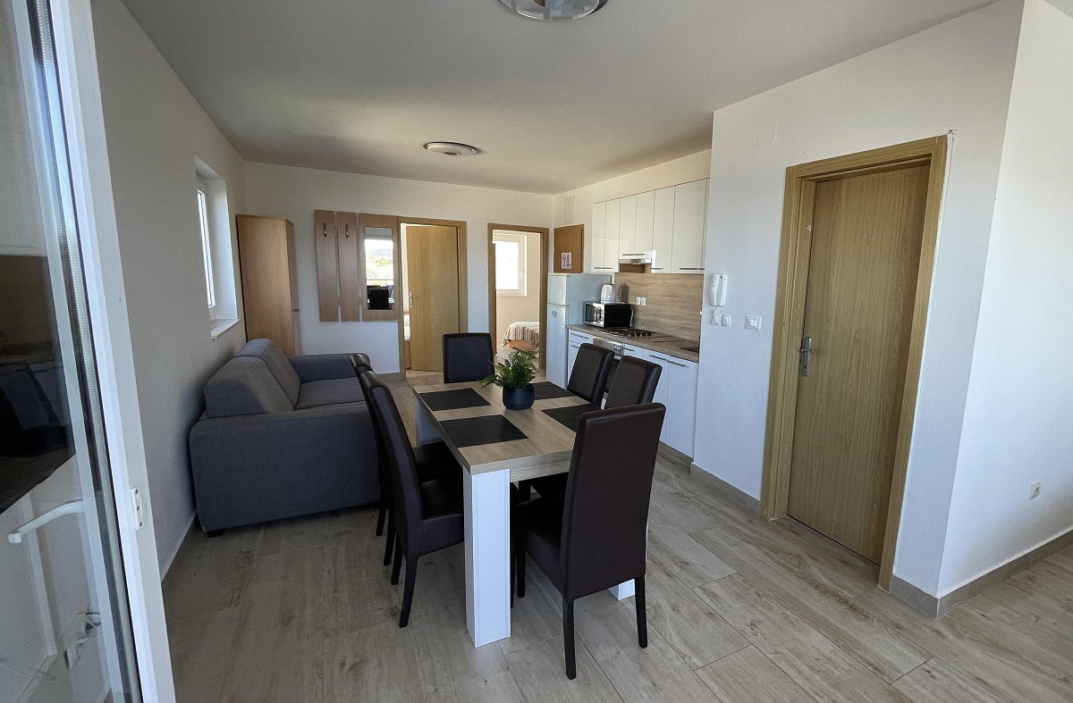 Apartmány B/4 – 2 oddělené ložnice se 2 lůžky, obývací místnost s kuchyňkou a rozkládacím gaučem, klimatizace, balkón, koupelna, WC.