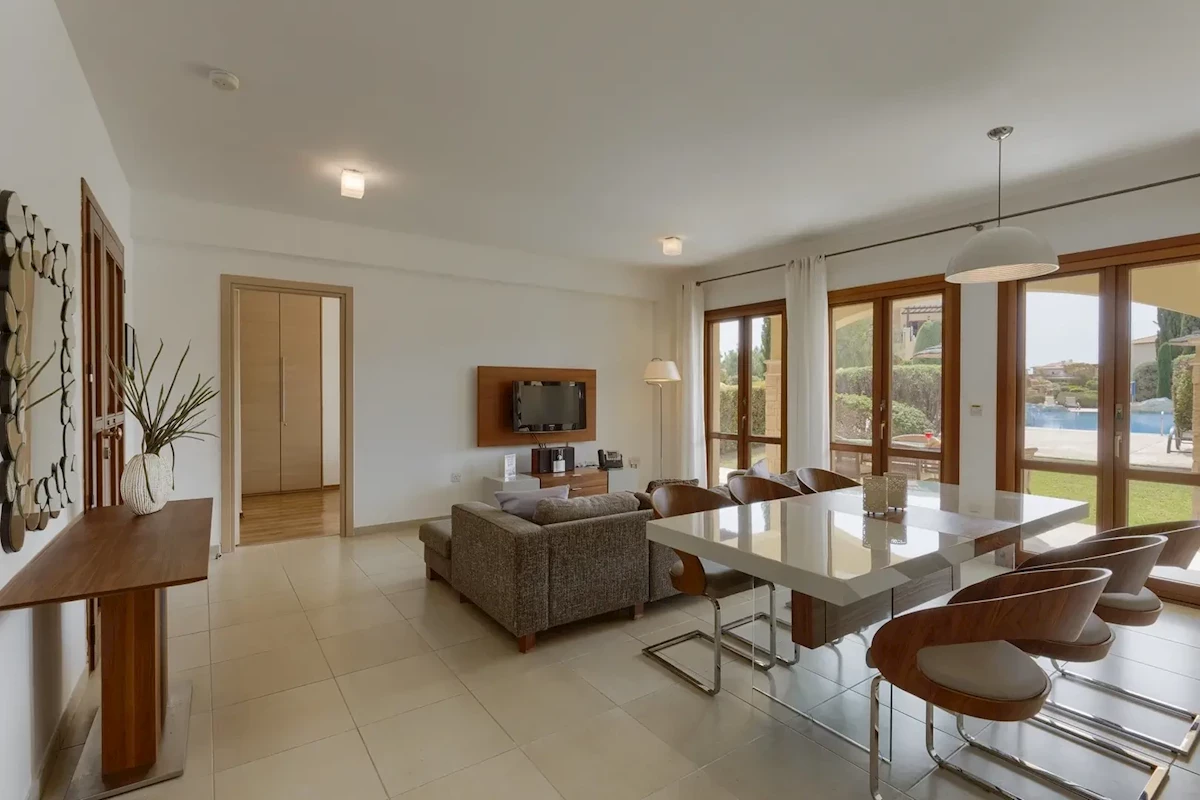 Štýlový, luxusný hotelový rezort, postavený v štýle tradičnej cyperskej dedinky je situovaný na pokojnom mieste, uprostred zelene s nádherným výhľadom na legendárnu Afroditinu skalu, len 15 km od centra malebného letoviska Paphos. Milovníci golfu ocenia moderné 18 jamkové ihrisko priamo pri hoteli. Dopravu na neďalekú piesočnatú pláž zabezpečuje hotelový minibus. Medzinárodné letisko Larnaca je vzdialené 135 km.Vybavenie