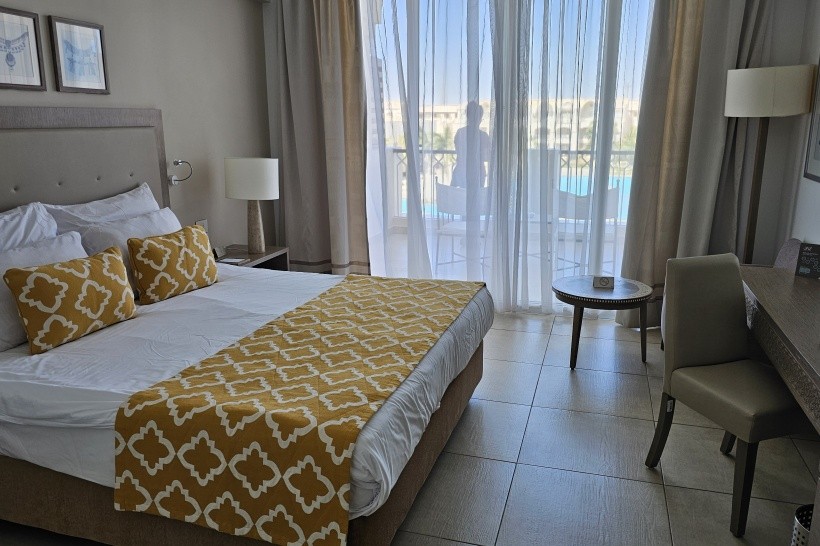 Skvělý čistý rozlehlý pokoj. Náš pokoj Deluxe měl plochu přes 70 m2 včetně až zbytečně velké koupelny se sprchou, rohovou vanou (samozřejmě jsme nevyužili), dvěma umyvadly a WC, v pokoji velká postel s kvalitní matrací (jedna velká na celou šířku, takže v noci "přenášení" pohybů a vrtění partnera na druhou polovinu) a s několika polštáři. Klimatizace funkční, hlučnost normální, ale neměla dálkové ovládání, takže bylo třeba manuální spouštění a vypínání. Přes prosklenou čelní stěnu přístup na terasu se stolkem a dvěma křesílky a malým sušákem na plavky. Televize s "nečeskými" programy, ale kvůli sledování TV jsme sem nejeli. Ubytování vynikající.