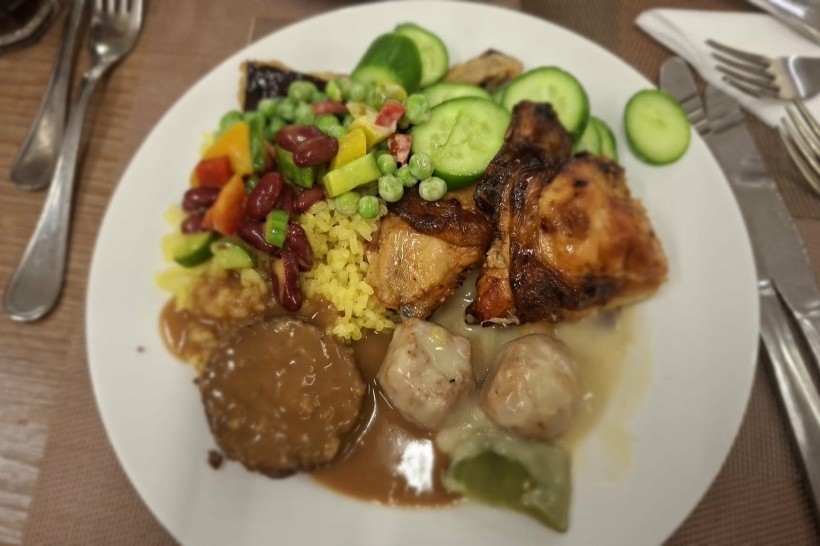 Hned první den nás jídlo mile překvapilo, bylo velmi pestré a chutné a každý si našel něco podle svého gusta, dokonce i naše děti, které jsou docela vybíravé v jídle. Jídla se podávala jak v teplých pokrmech, tak i čerstvě připravená pro každého hosta. Snídaně zahrnovala omelety, vejce, zeleninu, klobásy, široký výběr pečiva (chala, rohlíky, tmavý a bílý chléb), talíře uzenin a sýrů a tak dále. Oběd se skládal převážně z brambor v různých formách, rýže, několika druhů masa, omáček, masových kuliček, pizzy, hranolků a dvou polévek na výběr. K večeři byl k dispozici široký výběr nápojů. Dezerty zahrnovaly dorty, sušenky, sladké rohlíky a koblihy, vše pestré a lahodné. Těmto sladkým dobrotám se nedalo odolat. Veškeré pečivo a pečivo byly velmi dobré. Byl zde velký výběr ovoce. Večeře byla v podstatě pozdní – vše bylo k dispozici a byl široký výběr. Na místě byl konferenční stolek. Večeře v italské restauraci na konci dovolené byla velkým plusem - atmosféra byla na vysoké úrovni - příjemná změna oproti bufetu.