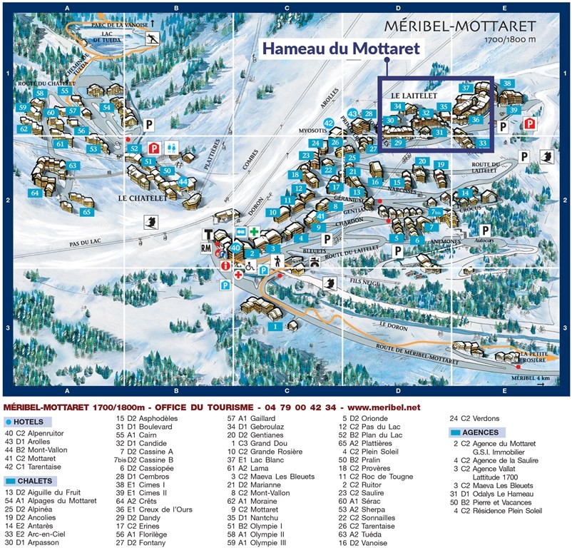 HAMEAU DU MOTTARET**Komplex rezidencí ležící přímo u dojezdu sjezdovek v Méribelu 1.800 v části Laitelet, s přímým vstupem k vlekům a obchodům, které jsou navzájem propojené. Ubytování nabízíme bez konkretizace budovy. Centrum je vždy max. 500 m. Povlečení a závěrečný úklid v ceně (kromě kuch. koutu a myčky). Wifi zdarma u recepce.