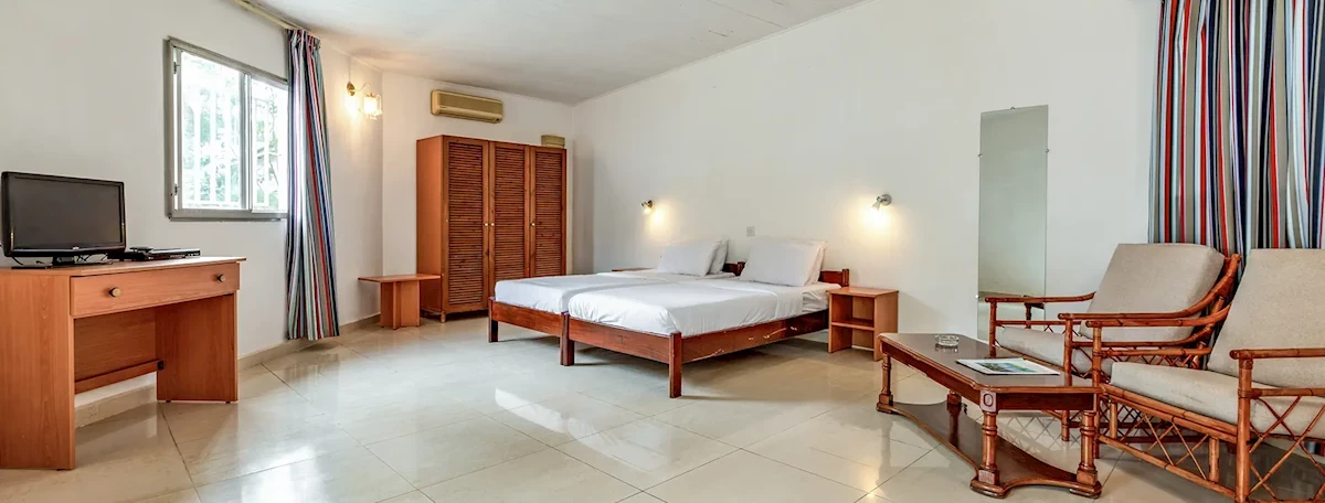 Hotel posiada 60 standardowych pokoi w budynku głównym i 92 w przestronnych, wygodnych bungalowach znajdujących się w zadbanym i ładnie zagospodarowanym ogrodzie. Większość pokoi z TV – sat, lodówka (dodatkowo płatna ok. 5,5 euro/dzień). Pokoje wyposażone w łazienkę z WC oraz taras. Pokoje standardowe (w budynku głównym) wyposażone są w wentylatory (ok. 4 EUR/dzień), pokoje w bungalow wyposażone są w klimatyzację indywidualnie sterowaną (ok. 10 euro/dzień). Sejf znajduje się w recepcji (dodatkowo płatny ok 1,5 euro/dzień + depozyt zwrotny 10 euro). Możliwość wstawienia łóżeczka dla dziecka (bezpłatnie), konieczna wcześniejsza rezerwacja.Położenie