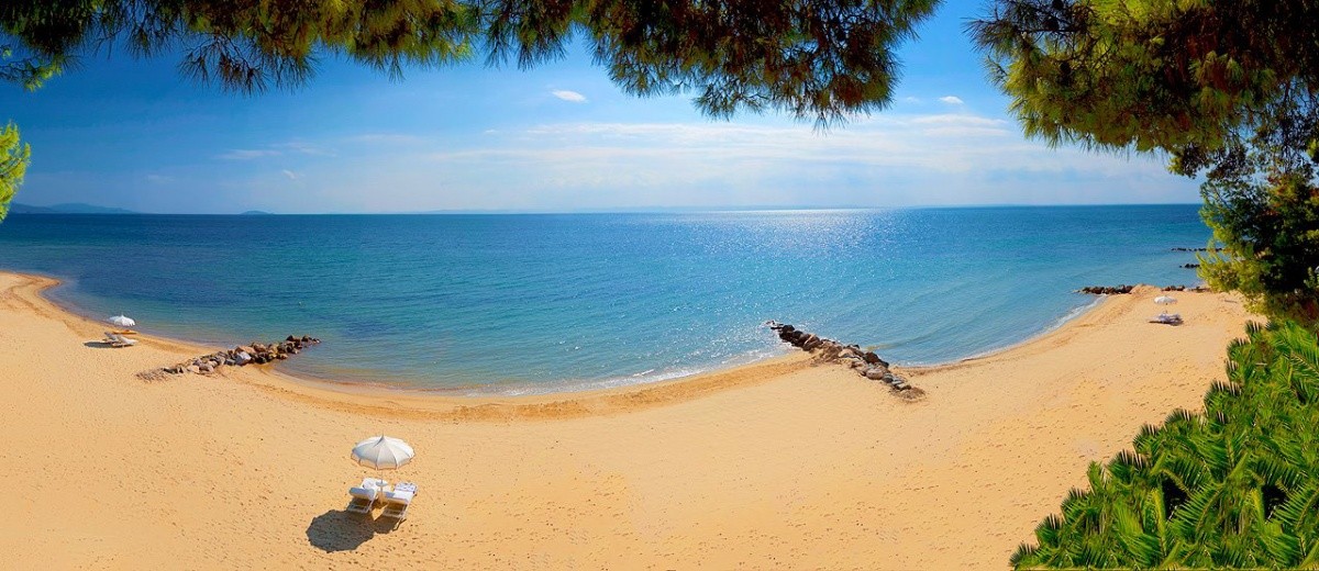 Lage & Umgebung Das elegante Hotel, welches von der Inhaberfamilie persönlich geführt wird, liegt auf dem zweiten Finger der Chalkidiki-Halbinsel. Umgeben von mediterranen Pinienbäumen, üppigen Gärten, weißen Sandstränden und türkisfarbenem Meer verteilen sich die sieben zweistöckigen Gebäude und eleganten Villen unter azurblauem Himmel. Das Hotel liegt inmitten einer parkähnlichen, ca. 2,5 ha großen, wunderschön bepflanzten Gartenanlage und bietet einen spektakulären Blick auf das kristallklare Wasser und die Schönheit der umgebenden Natur. Entspannung findet man auf den schattigen Terrassen oberhalb des Strandes, in einem der Restaurants oder an der Abendbar. Zwischen den 2 traditionellen Dörfern Metamorfosis (Fußweg ca. 2 km) und Nikiti (ca. 4 km) gelegen.