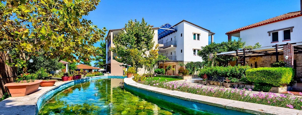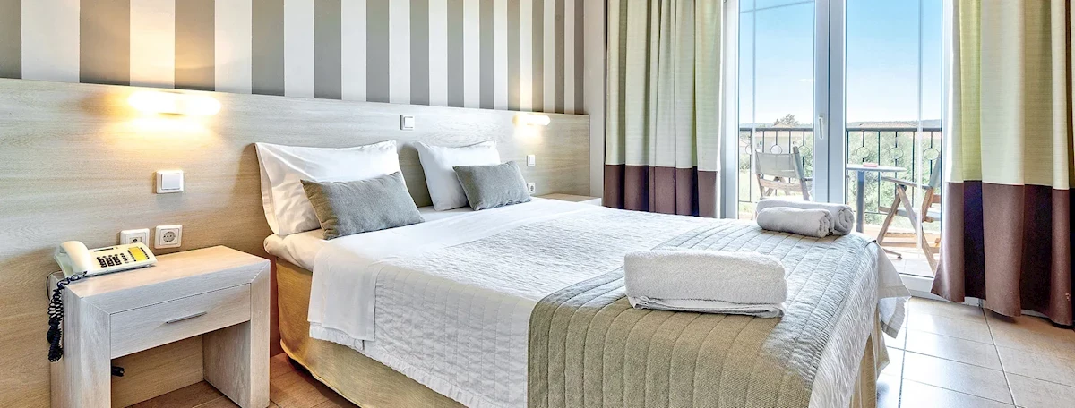 54 gustownie i przytulnie urządzonych pokoi 2-osobowych (możliwość 1 dostawki), z łazienkami (suszarka do włosów) i balkonami lub tarasami, rozlokowanych w kilku budynkach na terenie obszernego i wspaniale utrzymanego ogrodu. W pokojach znajduje się: telefon, lodówka (bezpłatna), TV-sat, sejf (dodatkowo płatny ok. 1 EUR/dzień), czajnik elektryczny oraz filiżanki, klimatyzacja (indywidualnie sterowana, płatna ok. 5 EUR/dzień, działająca w okresie 15.06-15.09).