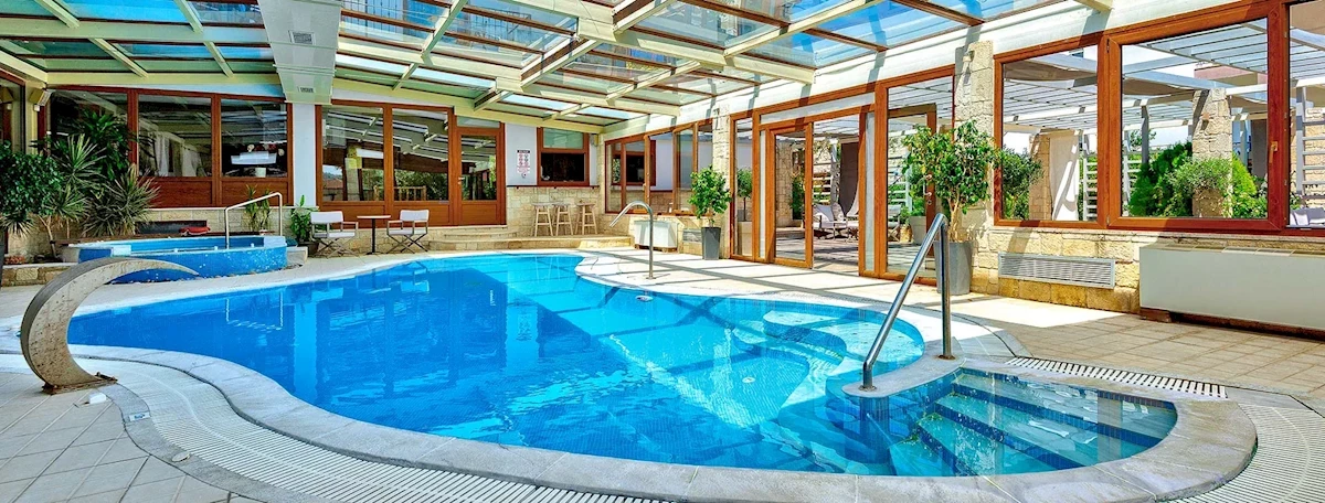 Recepcja 24h/7. 1 basen dostępny dla Gości hotelu, brodzik dla dzieci, basen kryty (od 18 roku życia) z oddzielną strefą wypoczynkową i jacuzzi, leżaki oraz parasole przy basenie - bezpłatne. Atrakcje dla dzieci: mini plac zabaw dla dzieci. Atrakcje dla dorosłych: centrum fitness z siłownią (bezpłatne), sauna oraz hammam (płatne ok. 5 EUR/os.), salon gier, bilard (płatny ok. 2 EUR/30 min.), szachy na wolnym powietrzu. Restauracje: restauracja z tarasem widokowym na zatokę serwująca dania kuchni greckiej oraz międzynarodowej, cafe-bar, bar przy basenie. Pozostałe informacje: sala TV z dostępnymi filmami DVD, kawiarenka internetowa (1 EUR/30 min.), wypożyczalnia książek i filmów DVD (w jęz. angielskim), wypożyczalnia rowerów (5 EUR/dzień), przechowalnia bagażu.