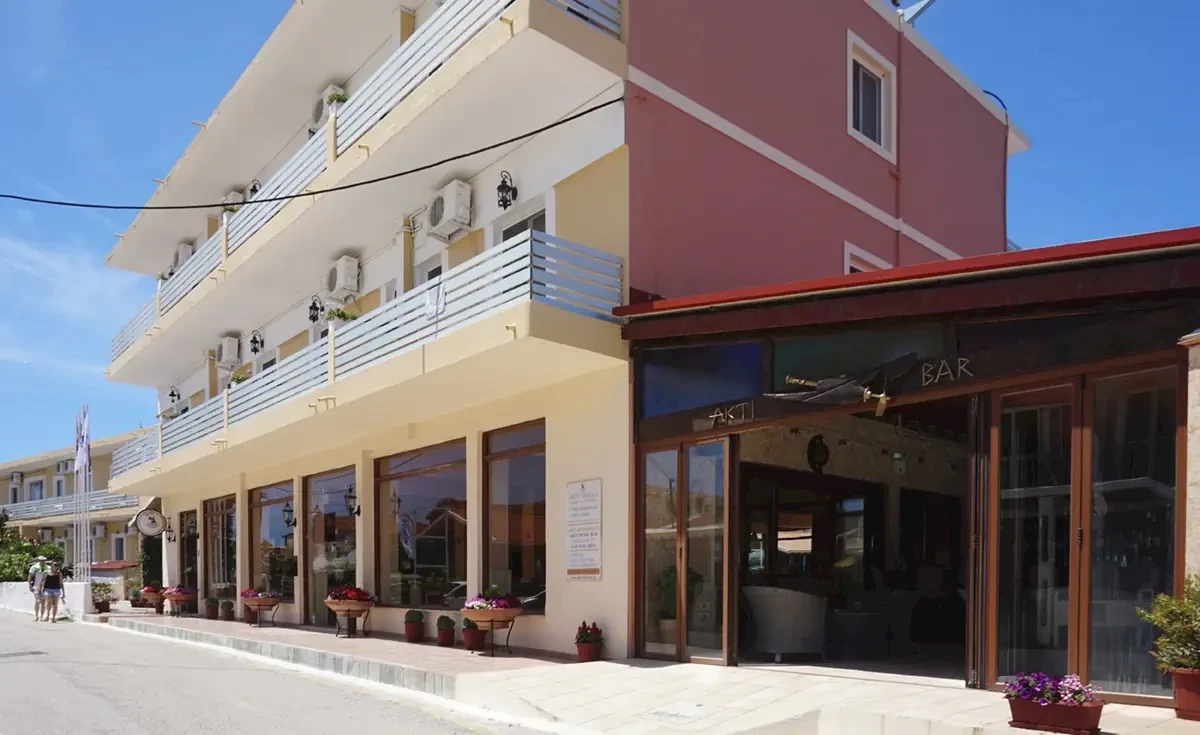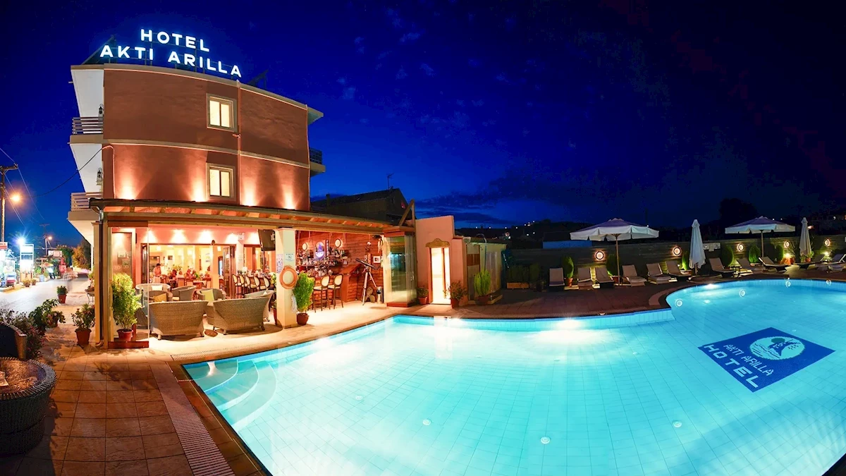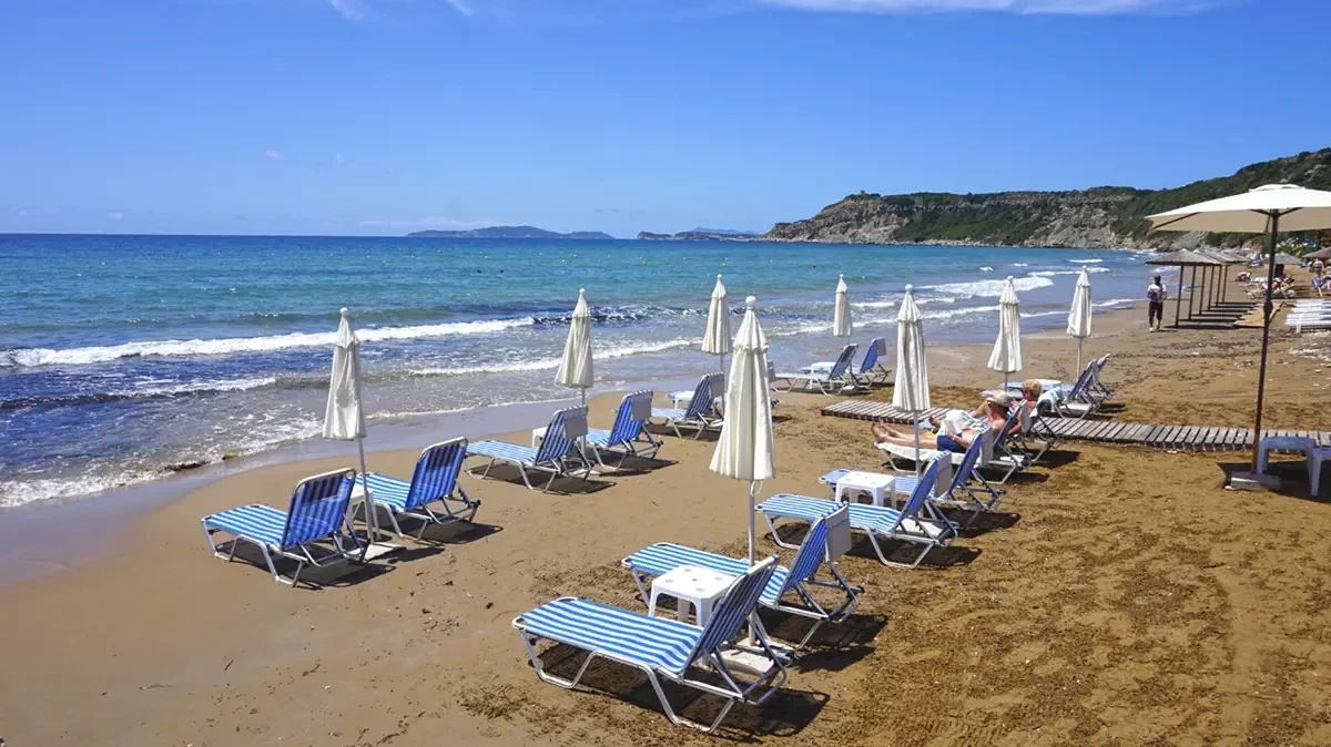 Pláž je od ubytování vzdálená cca 100 m, snadno dostupná, písečná. Voda (začátkem července) byla mírně studená, ale čistá. Na pláži jsou k pronájmu lehátka a slunečníky, restaurace a supermarket na rohu ulice vedoucí na pláž. Západ slunce v Arillas je nádherný, stojí za to ho vidět.