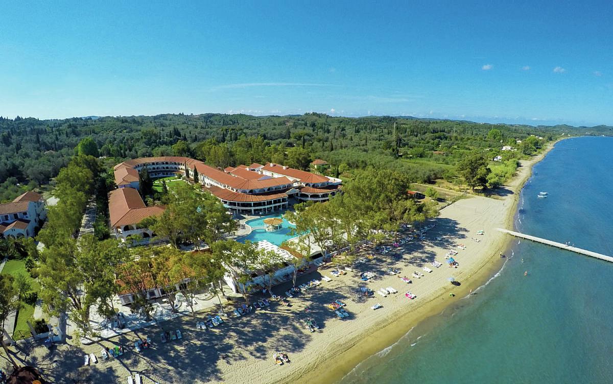 Elegantný hotelový rezort sa nachádza na pokojnom mieste v južnej časti ostrova, len 3 km od romantického mestečka Lefkimmi (dostupné hotelovým minibusom 2 x denne zdarma), priamo pri krásnej piesočnatej pláži. Nákupné možnosti a zábavu majú hostia priamo v hoteli alebo v centre mestečka Lefkimmi (taverny, bary, kaviarne, obchody, zastávka autobusu, požičovňa automobilov, trh). Medzinárodné letisko Kerkyra je vzdialené 40 km od ubytovania.Vybavenie