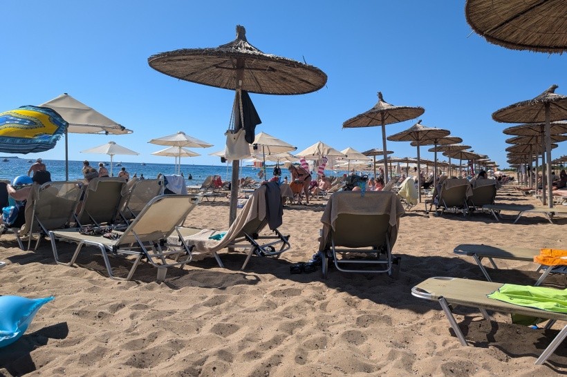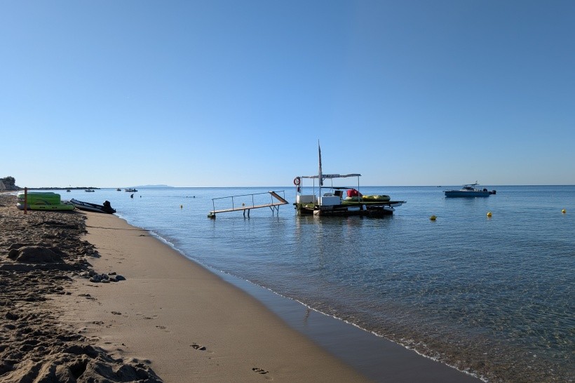 Pláž byla čistá, jeden jediný den po bouřce byly při vstupu do moře chaluhy, ale potom nějak samy zmizely, jinak moře průzračné a teplota přesně podle mého gusta, osvěžilo, nebylo ani moc studené ani moc teplé, teplotu jsme neměřili. Lehátek dostatek, vždy se dalo najít volné v kteroukoli denní dobu. Jediné, co nám chybělo, byly malé stolečky mezi lehátky, které měli klienti jen v prvních řadách lehátek na pláži a další řady už měly smůlu. Ale dalo se to vydržet i bez nich, pokud bylo sucho, měli jsme věci přímo na písku..