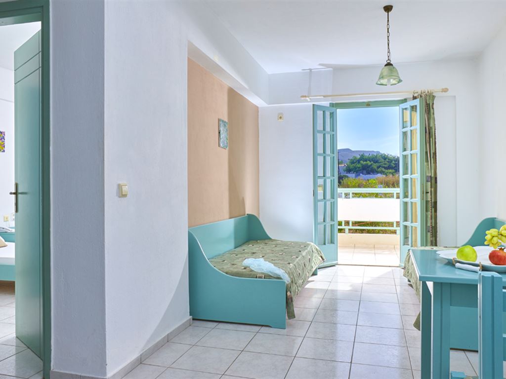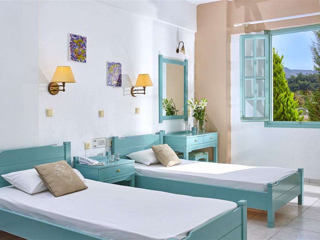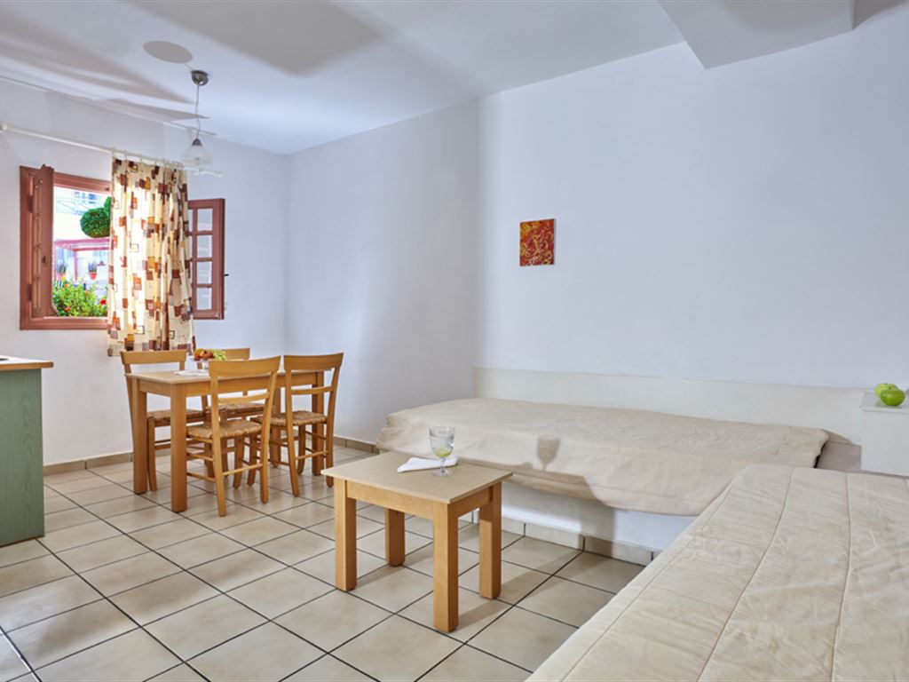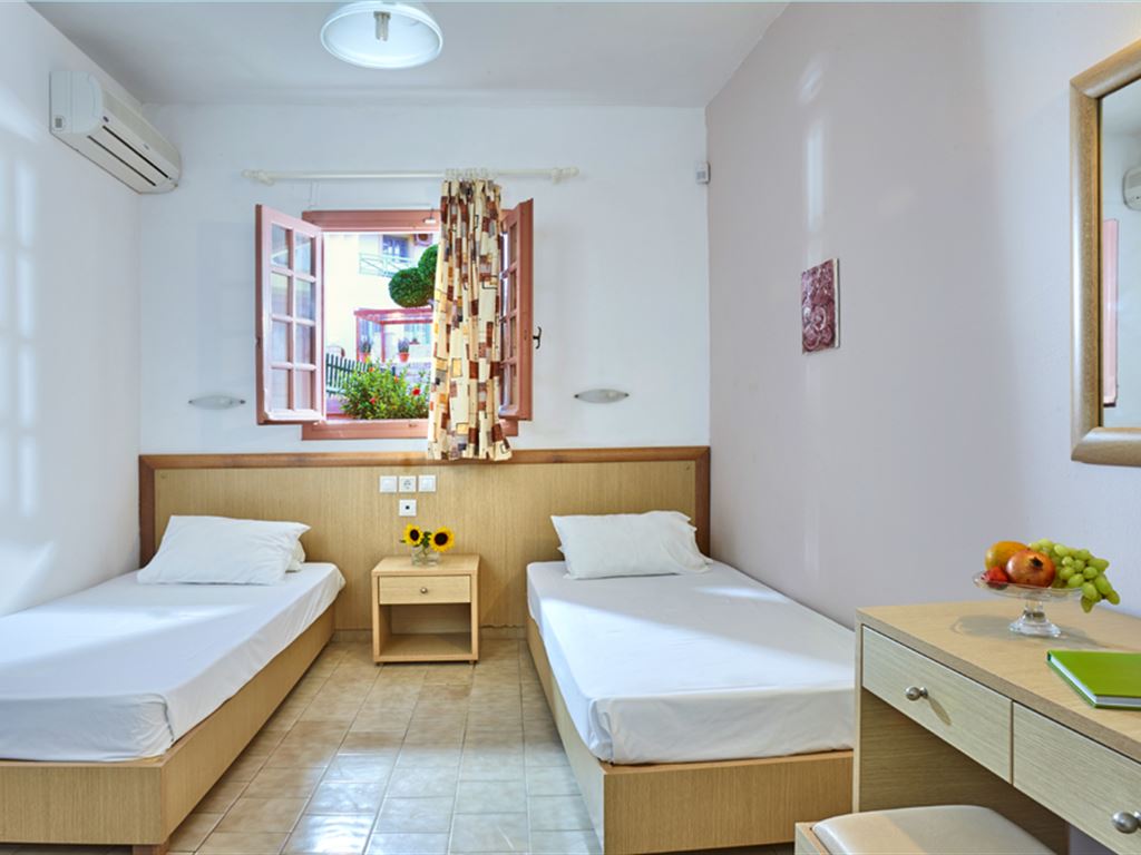 K dispozícii je 46 izieb, najmä štúdií až pre 2 osoby vybavené kúpeľňou s WC, spálňou s kuchynským kútom a balkónom alebo terasou, apartmány s 2 miestnosťami (spálňa a obývacia časť s kuchynským kútom) majú tiež balkón alebo terasu. Všetky typy ubytovania majú trezor, klimatizáciu, TV, telefón a 2 izby sú zariadené pre handicapovaných klientov (na vyžiadanie).Strava