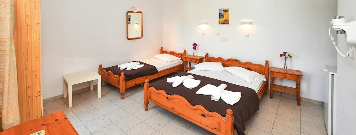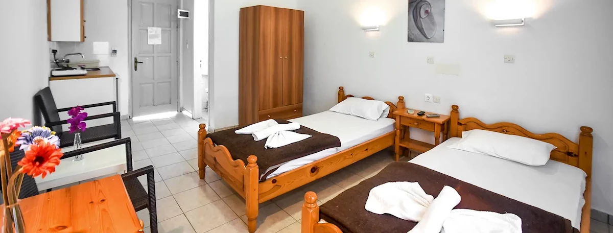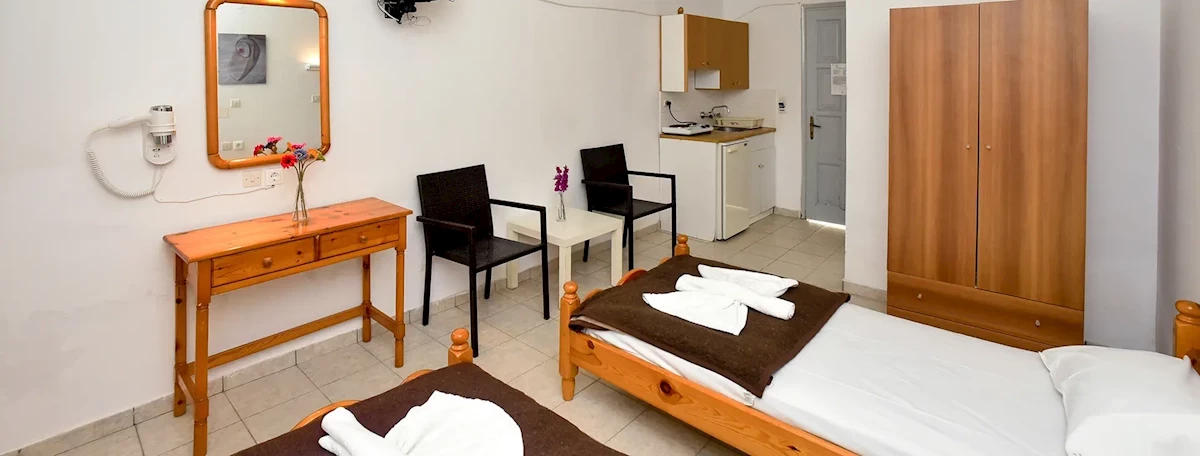 Pokoje typu studio z możliwością zakwaterowania 2 lub 3 osób. W pokojach TV Sat, lodówka, aneks kuchenny, łazienka z WC, prysznicem oraz suszarką. Pokoje posiadają balkon lub taras. Płatne dodatkowo: klimatyzacja (ok. 8 EUR/dzień). Łóżeczko dla dziecka do lat 2 bezpłatne, na potwierdzenie.