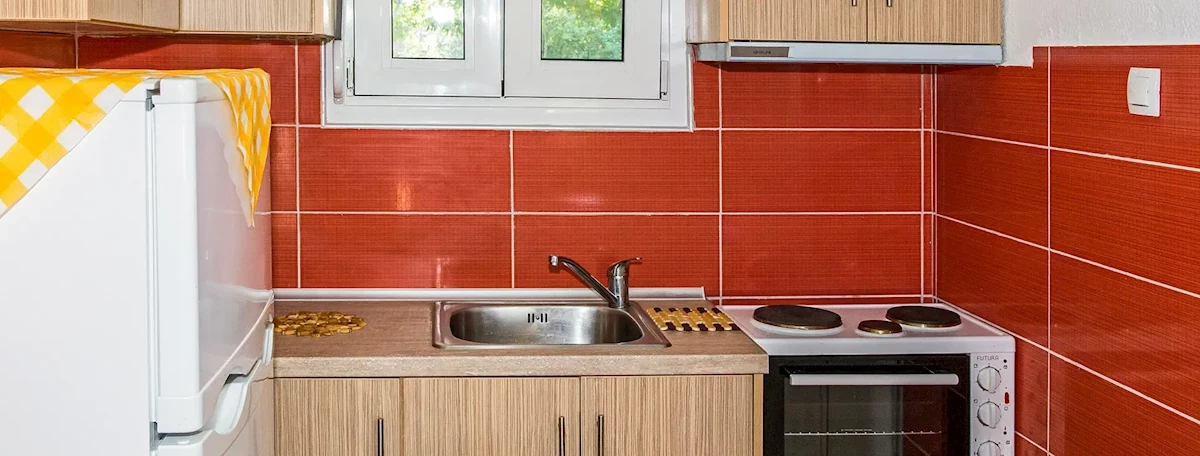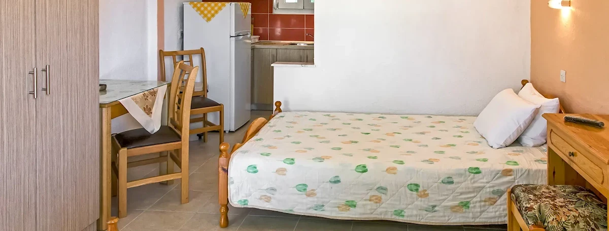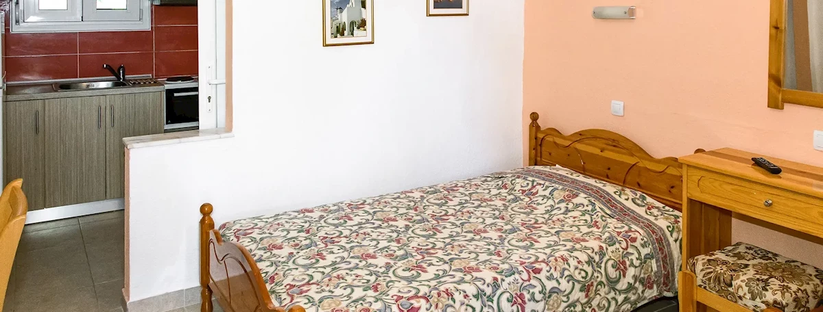 Niewielkie, funkcjonalnie wyposażone pokoje typu studio, które składają się z pokoju dziennego pełniącego jednocześnie funkcję sypialni dla 2 osób, aneksu kuchennego z podstawowym wyposażeniem (lodówka, kuchenka, naczynia i sztućce), łazienki z wc oraz niewielkiego balkonu/tarasu - z meblami ogrodowymi. Ponadto TV-SAT, klimatyzacja (dostępna w niektórych studiach, indywidualnie sterowana, dodatkowo płatna ok. 5 EUR/dzień). Większość studiów została wyremontowana w 2014/2015 r., w sprzedaży dostępne są również pokoje economy przed remontem. Ręczniki i środki czystości we własnym zakresie.Brak łóżeczek dla dzieci.