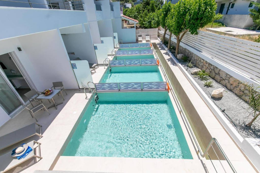 Menší apartmánový komplex nabízí několik typů pokojů – od standardních pokojů přes superior až po suity s bazénem či vířivkou, všechny v moderním, čistém stylu. Všechny jednotky mají vlastní koupelnu (sprcha, WC, fén, toaletní potřeby), klimatizaci, TV s plochou obrazovkou, Wi‑Fi zdarma, kuchyňku (varná deska, mini-lednice, základní nádobí, konvice), trezor a balkon nebo terasu, většinou s výhledem na bazén nebo zahradu.