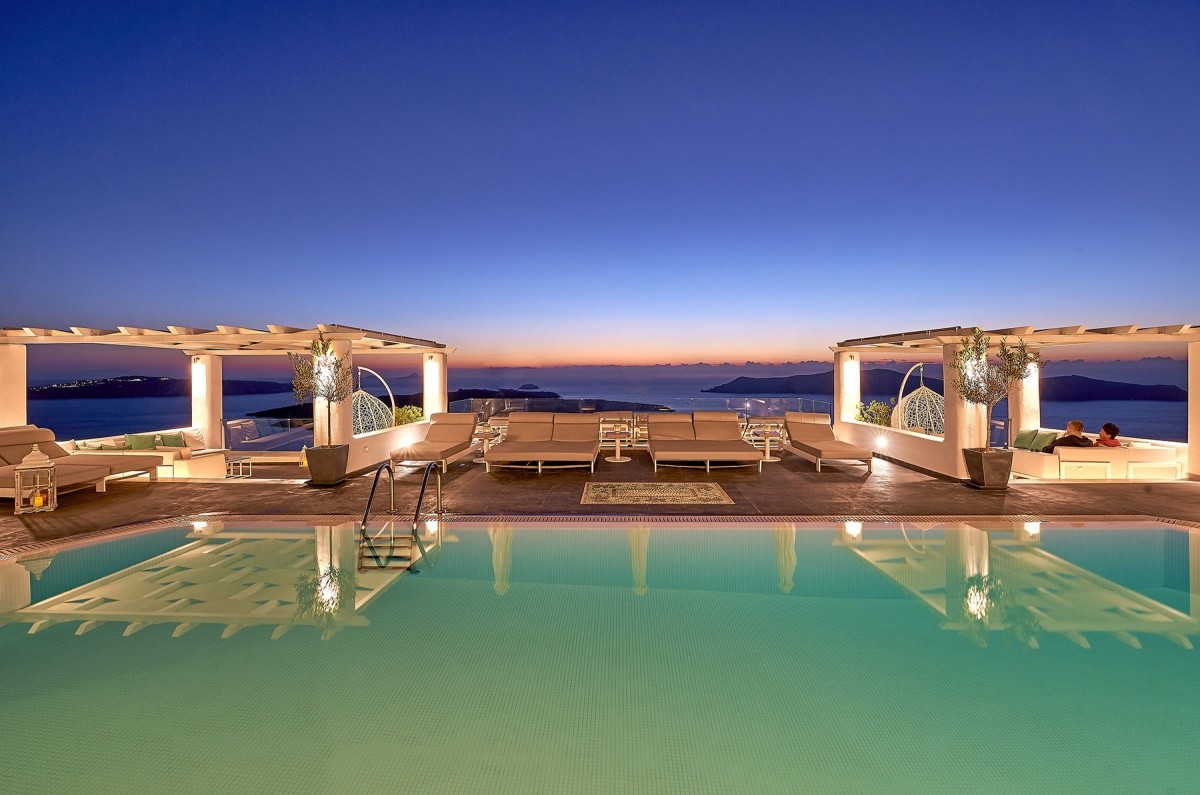 Lage & Umgebung Das Hotel erfreut sich bester Lage im Ort Firostefani, nur ein paar Schritte von Fira entfernt. In dieser Umgebung vereinen sich Ruhe und Behaglichkeit. Das Dorfzentrum ist sehr nah, wo es eine Auswahl verschiedener Restaurants und Bars zu entdecken gibt. Die Strände von Monolithos und Imerovigli sind vom Hotel aus erreichbar. Das archäologische Museum von Thira, das St.-Nikolaus-Kloster und die katholische Kirche sind jeweils etwa 800 m vom Hotel entfernt. Nach Skaros sind es rund 1,8 km. Der Flughafen Santorin (Thira) liegt in etwa 32 km Entfernung vom Hotel.