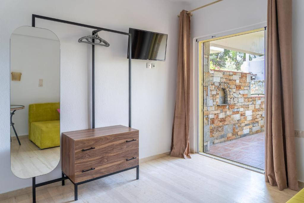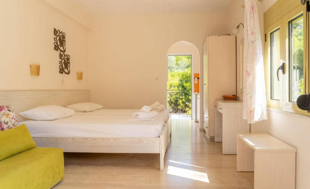 Vybavení pokojů: koupelna (sprcha, WC), klimatizace, Wi‑Fi zdarma, SAT/TV (v některých studiích), plně vybavený kuchyňský kout s vařičem, lednicí, kávovarem, rychlovarnou konvicí a základními kuchyňskými potřebami, balkon nebo terasa s výhledem do zahrady či okolní zeleně.