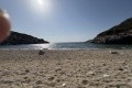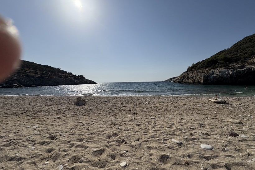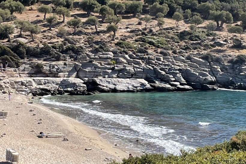 Príjemná, menšia piesočnatá pláž s pozvoľným vstupom do mora a priezračne čistou vodou sa nachádza priamo pred rezortom (prístup po strmší ceste). Klientom sú k dispozícii lehátka a slnečníky (zadarmo). Hotel zaisťuje pravidelnú, kyvadlovú dopravu na preslávenú pláž Psili Amos zadarmo.
