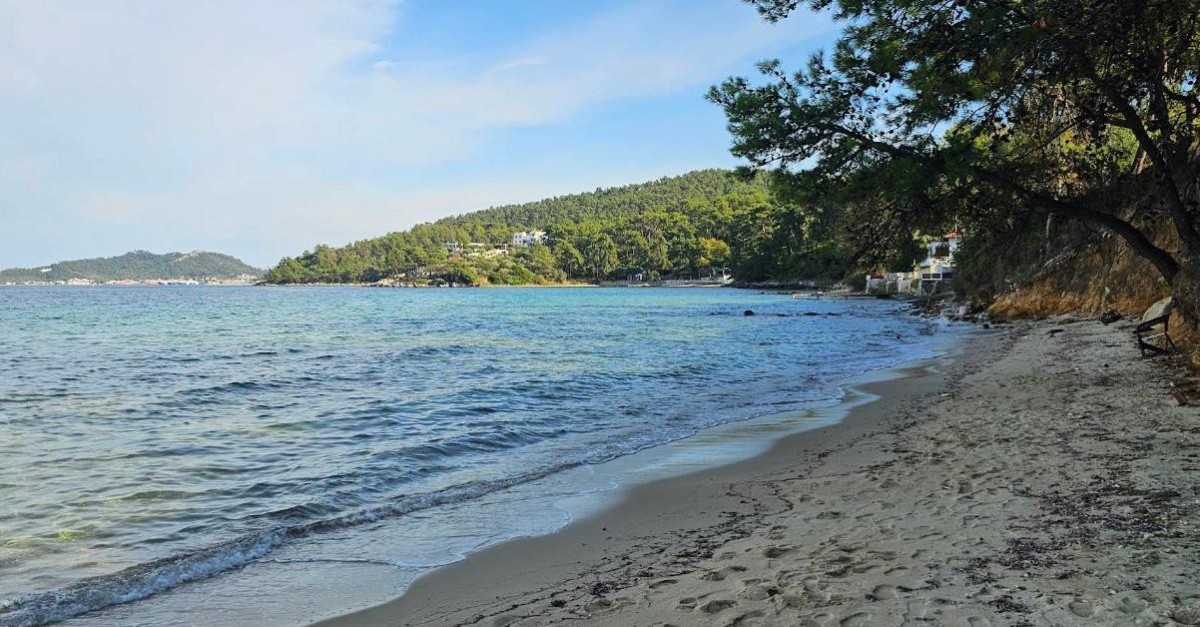 Voda je modrá, ale pláž je malá a špinavá, protože je veřejná.
