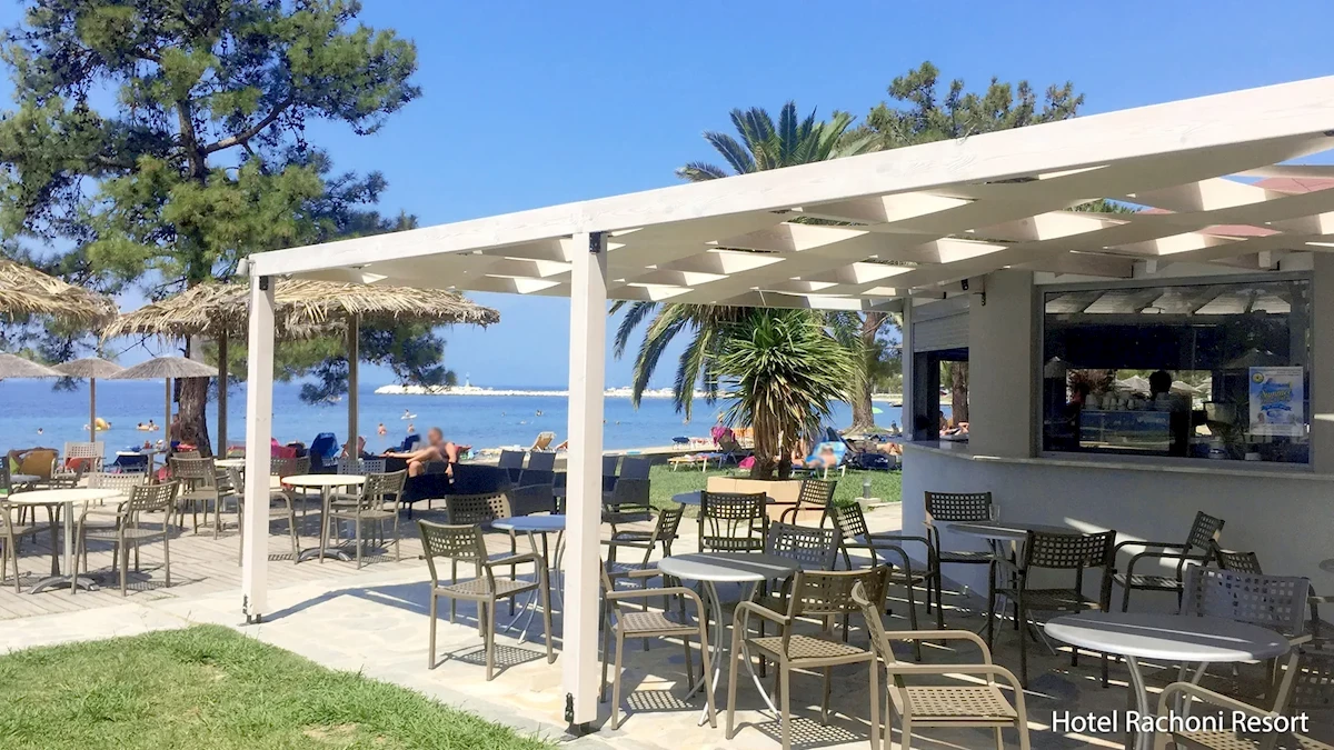 Na jídlo se chodilo cca 150 m do hotelu Rachoni Bay. Výběr jídel byl menší, ale jídlo bylo chutné. Občas mohlo být teplejší. Při větším náporu personál nestíhal včas doplňovat pokrmy a nádobí.