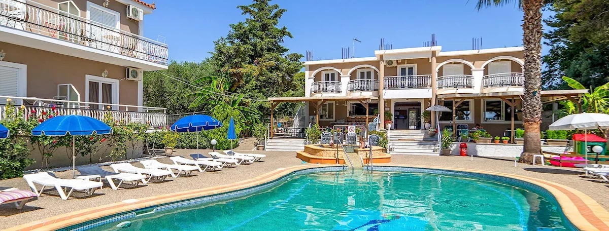Oddalony o ok. 6,5 km od lotniska. Bardzo blisko centrum miejscowości Laganas, tylko ok. 600 m do głównej ulicy z barami, restauracjami i sklepami. Do stolicy wyspy Zakynthos tylko ok. 8 km. Posiada doskonałe połączenie lokalną komunikacją (przystanek oddalony o ok. 600 m) lub taksówką z sąsiednimi miejscowościami. Hotel posiada świetną lokalizację w spokojnym zakątku, ale bardzo blisko centrum miejscowości Laganas.Plaża